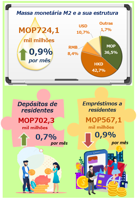 Quando comparado com o mês anterior, a circulação monetária e os depósitos à ordem cresceram 6,7% e 4,7%, respectivamente. M1, assim, cresceu 5,2%, relativamente ao mês anterior. Por enquanto, as responsabilidades quase monetárias cresceram 0,4%. A soma destes dois elementos, ou seja, M2, cresceu 0,9% relativamente ao mês anterior, tendo atingido MOP724,1 mil milhões. Quando comparado com o período homólogo de 2022, M1 decresceu 2,2% mas M2 cresceu 4,6%. A proporção da pataca (MOP), dos dólares de Hong Kong (HKD), dos renminbi (RMB) e dos dólares dos Estados Unidos (USD) registou os “pesos” de 36,5%, 42,7%, 8,4% e 10,7%, respectivamente, em M2.