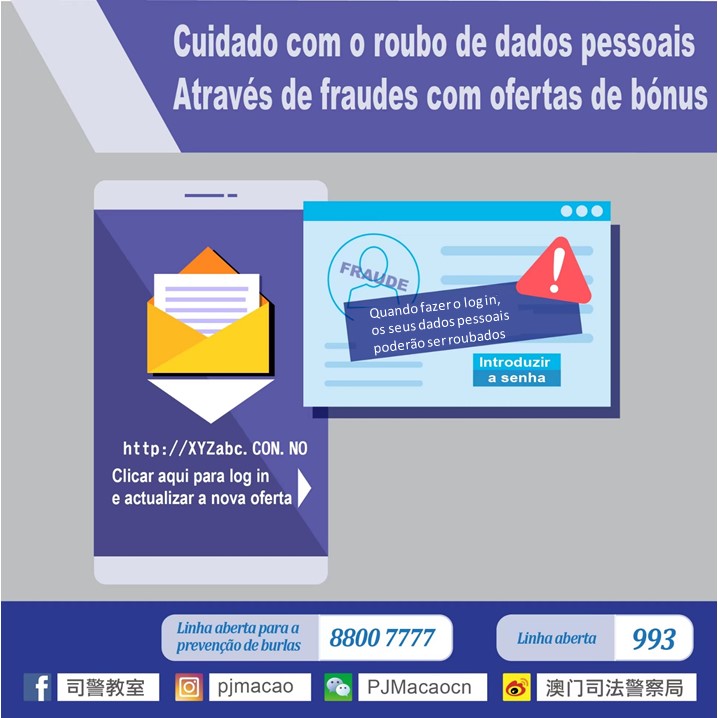 Nos últimos dias, a PJ tomou conhecimento que os burlões emitiram mensagem para vários telemóveis alegando que os pontos para o bónus de recompensa de uma plataforma estavam a expirar, induzindo as suas vítimas a fazerem o log in de um website fraudulento a fim de roubarem os dados pessoais e de cartão crédito. Um pouco antes, a plataforma envolvida já tinha emitido um o esclarecimento e o alerta para a prevenção de burla.