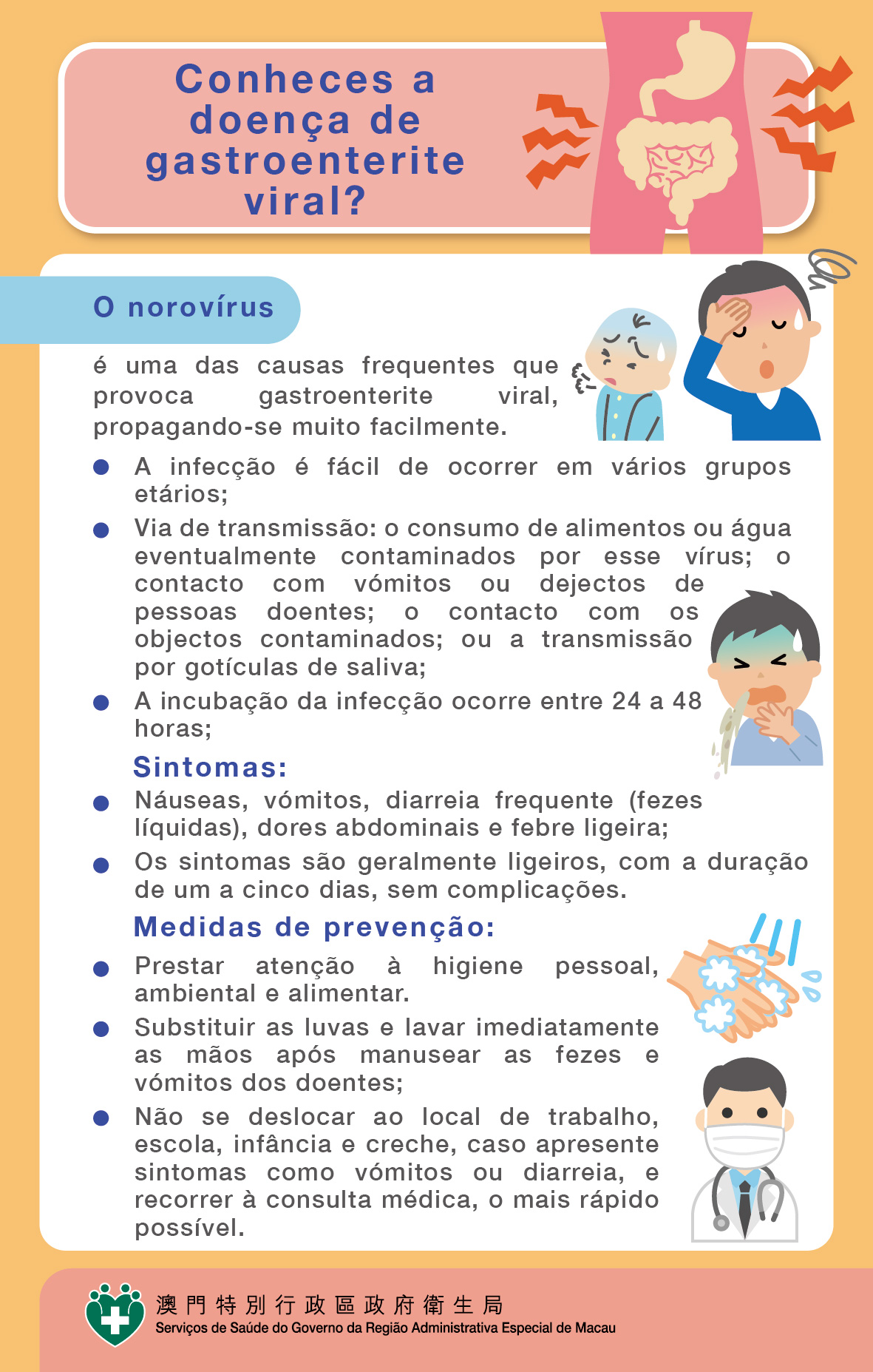 Os Serviços de Saúde recomendam à população que preste atenção à higiene pessoal, ambiental e alimentar. Acresce que caso os profissionais do sector da restauração ou o pessoal de enfermagem manifestem sintomas como vómitos ou diarreia para não se apresentarem o local de trabalho e recorram a assistência médica, adoptando medidas rigorosas de higiene pessoal, de modo a evitar a propagação da doença. Em caso de aparecerem doentes suspeitos, o pessoal prestador de cuidados de saúde deve ter a máxima cautela aquando do contacto com os doentes. Recomenda-se a todos as creches, escolas, lares e outras instituições similares que na ocorrência ou identificação de uma situação de infecção colectiva para contactarem de imediato o Centro de Prevenção e Controlo da Doença dos Serviços de Saúde através do número de telefone 28561122, para efeitos de acompanhamento imediato.
