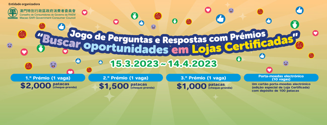 Para divulgar com maior força a “Loja Certificada” como um meio de garantia da confiança de consumo, o CC realiza o Jogo de Perguntas e Respostas com Prémios “Buscar oportunidades em Lojas Certificadas”, cujo prazo de inscrição decorrerá entre 15 de Março e 14 de Abril de 2023.