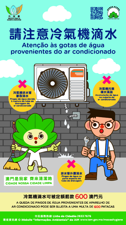 Com o aumento gradual das temperaturas, alguns cidadãos começaram a ligar os aparelhos de ar condicionado. O Instituto para os Assuntos Municipais (IAM) apela a que os cidadãos inspeccionem o tubo de drenagem dos ares-condicionados antes da sua utilização. Caso se verifique a situação de água a pingar, devem chamar rapidamente técnicos profissionais, para inspecção e reparação, de modo a evitar impacto para a salubridade pública.
