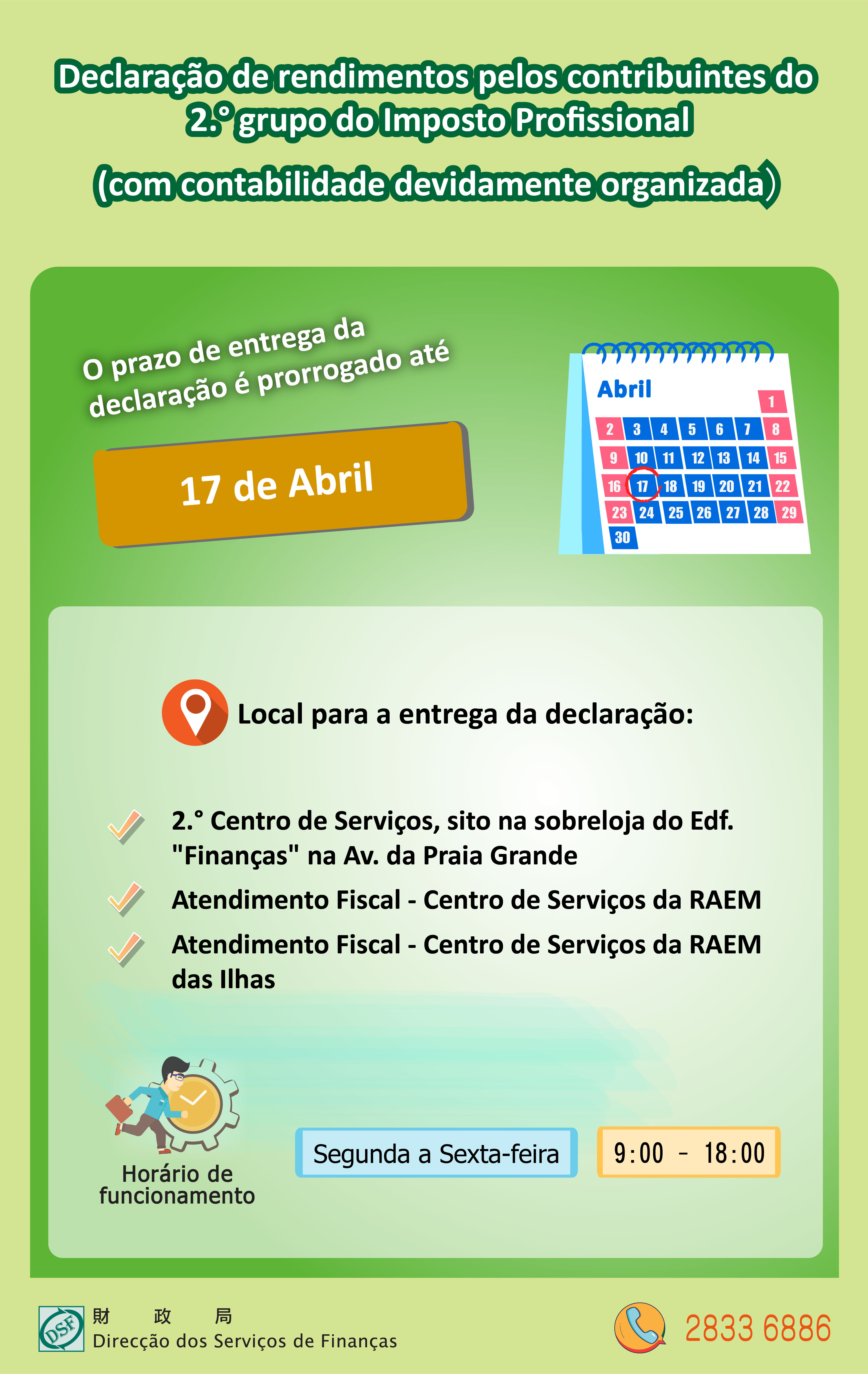 Para mais informações, ligue para a Linha Aberta para informações fiscais através do n.º 2833 6886.