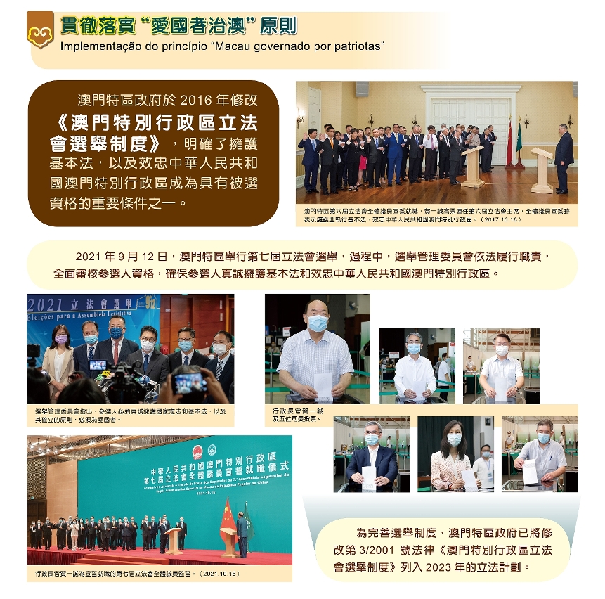 Quanto à Implementação do princípio “Macau governado por patriotas”, no decurso das eleições para a 7.ª Assembleia Legislativa de Macau, concretizou-se eficazmente este princípio. Para aperfeiçoar o regime eleitoral, o Governo da RAEM incluiu a revisão do Regime Eleitoral da Assembleia Legislativa da Região Administrativa Especial de Macau no plano legislativo de 2023.