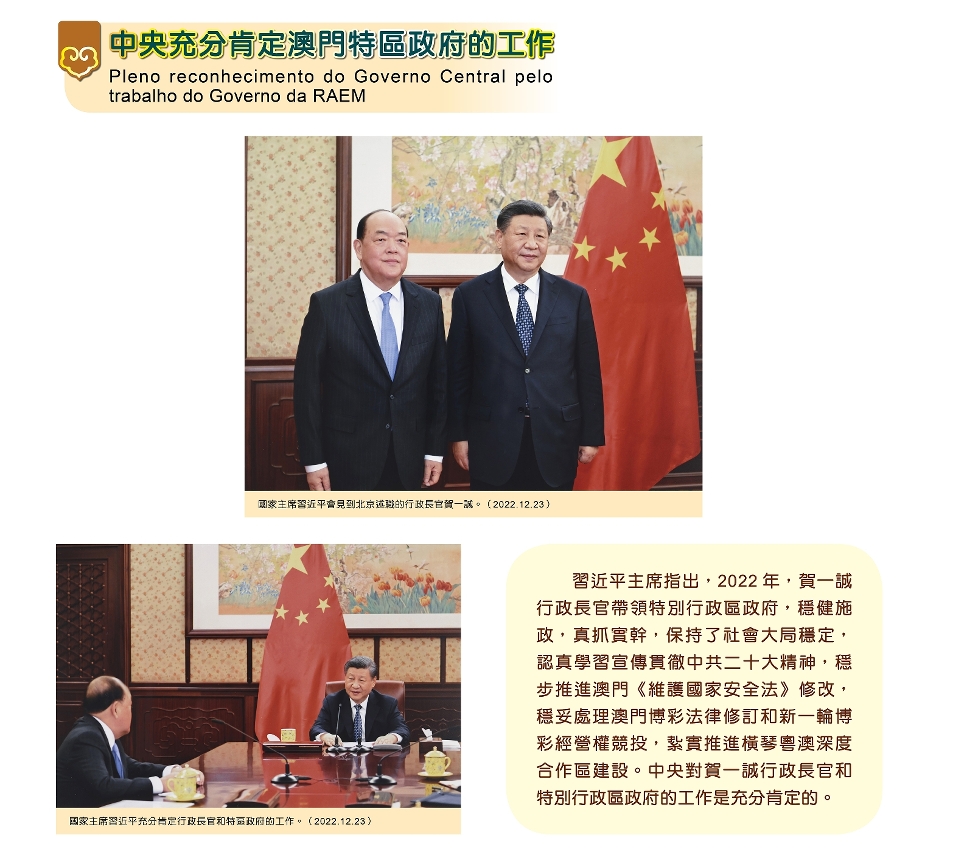 Em Dezembro de 2022, o Presidente Xi Jinping ouviu a apresentação do relatório de trabalho do Chefe do Executivo da RAEM, Ho Iat Seng, e reconheceu plenamente o trabalho desenvolvido pelo Chefe do Executivo e todo o Governo da RAEM.