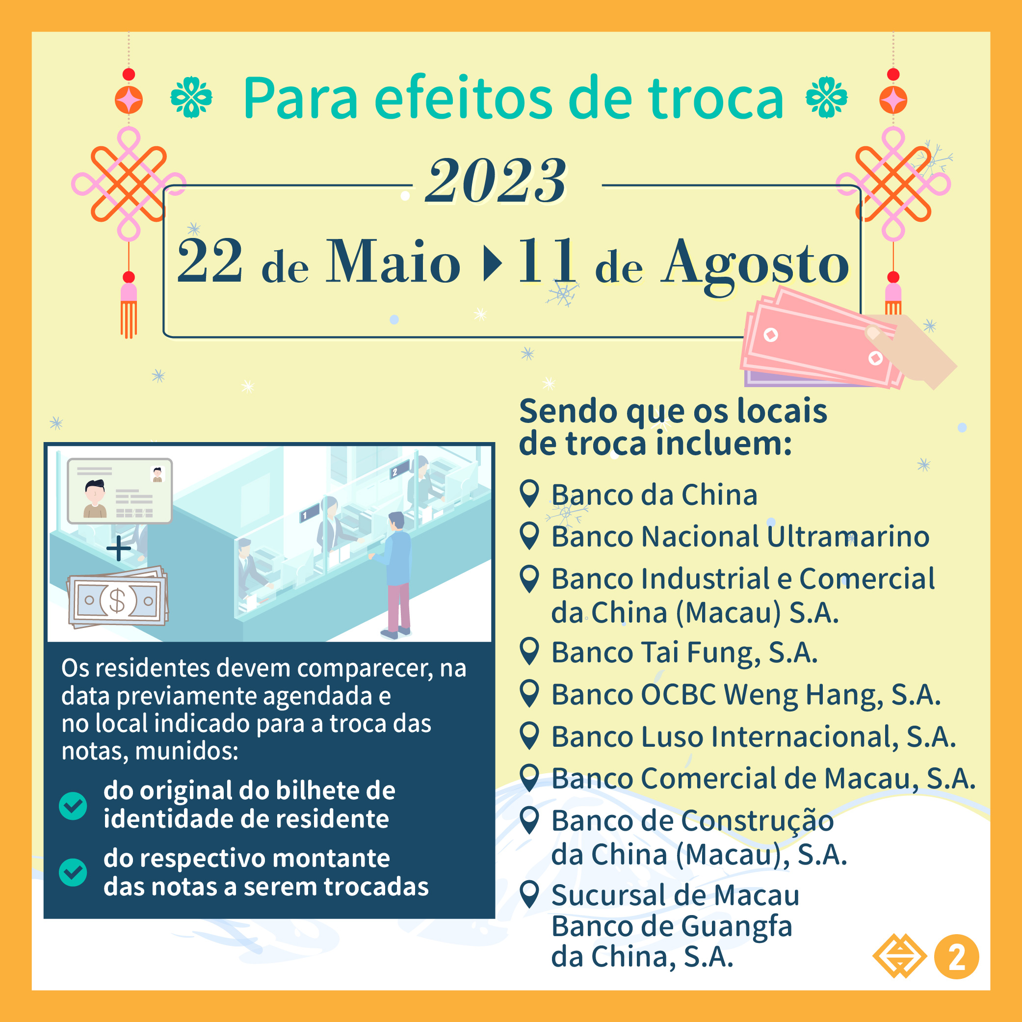 As notas zodiacais dos Anos do Tigre e do Coelho e das notas para a celebração da 24ª Edição dos Jogos Olímpicos de Inverno estarão disponíveis para troca a partir de hoje (dia 22) até ao dia 11 de Agosto de 2023. Os residentes de Macau que efectuaram a subscrição para efeitos de troca devem fazer-se acompanhar do original do seu bilhete de identidade de residente e comparecer, na data previamente agendada, na agência indicada para a troca das notas, sendo que o número de cada tipo de notas zodiacais dos Anos do Tigre e do Coelho que cada banco emissor disponibilizará para troca, por cada residente de Macau subscritor, é de 30 (trinta) unidades, enquanto que o número de notas para a celebração da 24ª Edição dos Jogos Olímpicos de Inverno que o Banco da China disponibilizará para troca é de 4 (quatro) unidades, pelo que as referidas notas disponíveis para troca totalizam 124 (cento e vinte e quatro) unidades, cujo valor envolvido ascende a mil e duzentas e oitenta patacas.