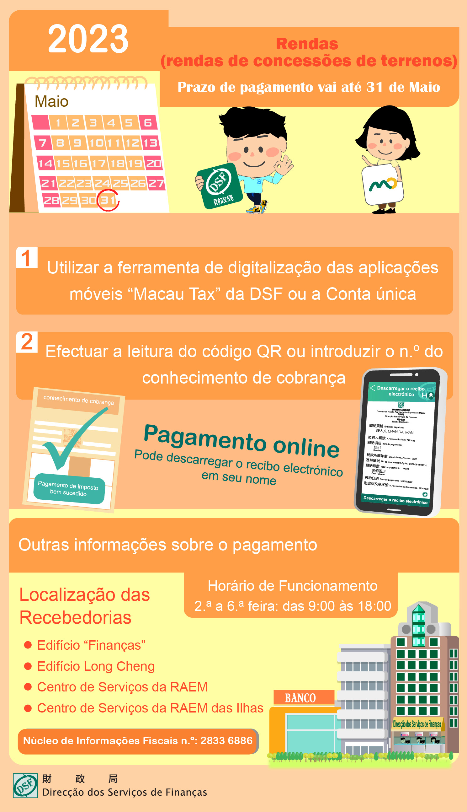 O prazo para o pagamento das rendas (rendas de concessões de terrenos) referentes ao ano de 2023 vai até 31 de Maio, para evitar a perda de tempo em filas de espera ou o pagamento adicional de juros de mora e a multa fixada, pelo pagamento fora de prazo, a Direcção dos Serviços de Finanças apela aos contribuintes para efectuarem o respectivo pagamento com a maior brevidade possível.