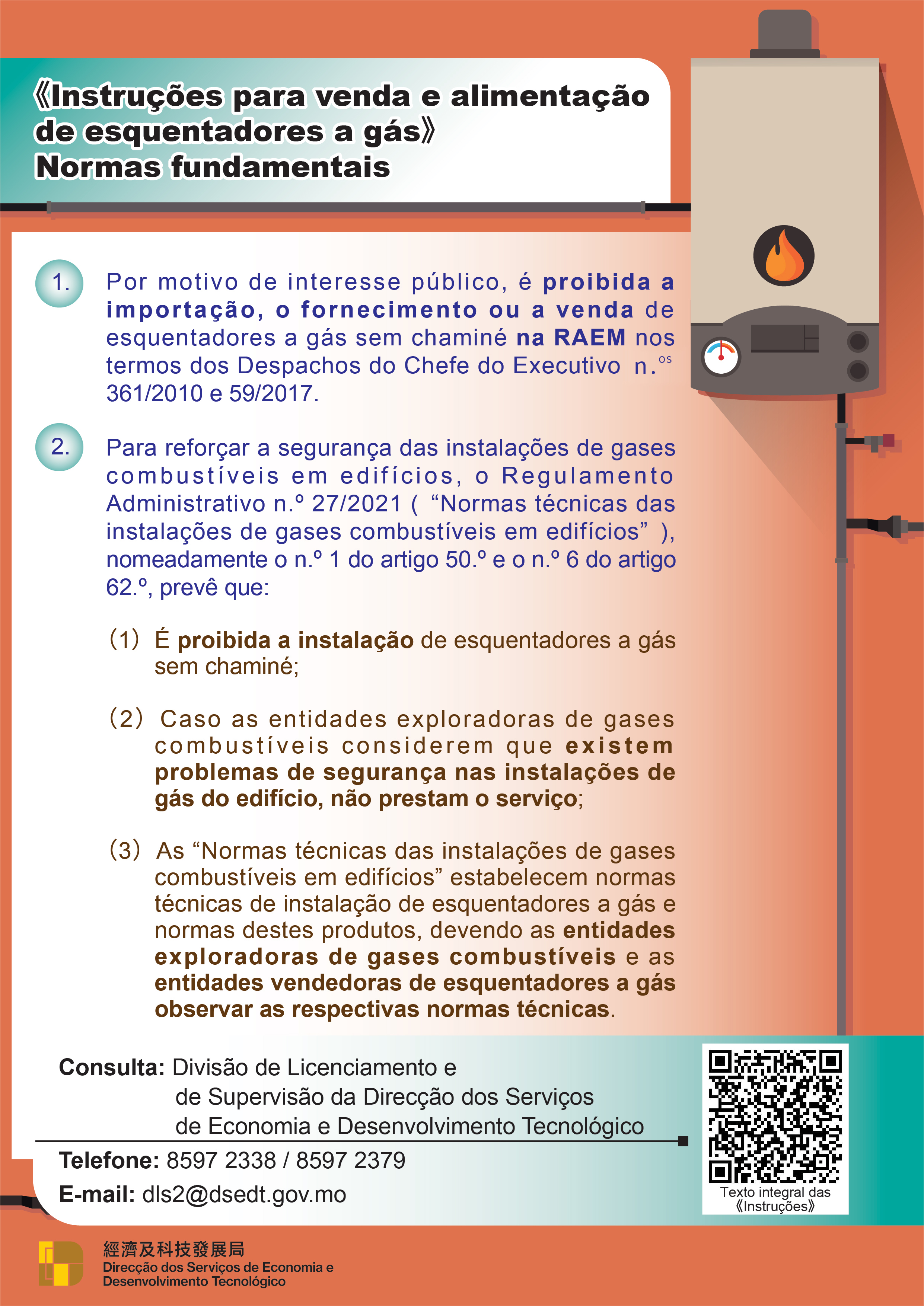 Para mais informações sobre as “Instruções para venda e alimentação de esquentadores a gás”, os interessados podem consultar a página electrónica da DSEDT ( https://www.dsedt.gov.mo ) ou digitar o código QR.