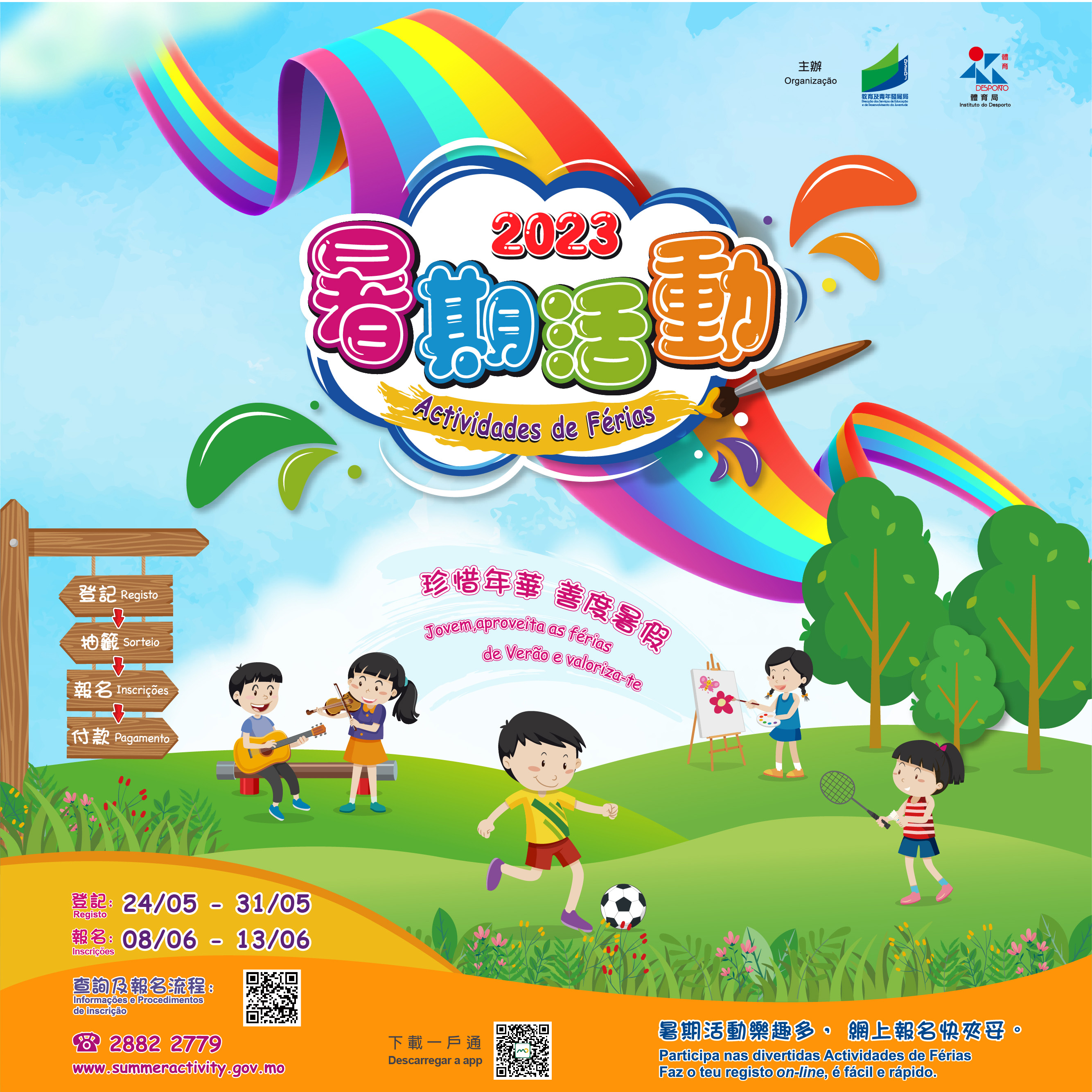 Decorreu, sem sobressaltos, o registo online nas Actividades de Férias 2023, organizadas conjuntamente pela Direcção dos Serviços de Educação e de Desenvolvimento da Juventude e pelo Instituto do Desporto, nas Actividades de Férias do corrente ano foram registado e sorteados num total de mais de 31,000 pessoas. Todos os interessados que conseguiram o registo podem consultar o resultado do sorteio a partir das 10h00 do dia 6 de Junho, no Website das Actividades de Férias www.summeractivity.gov.mo, e o resultado será também enviado por SMS para cada um dos participantes.