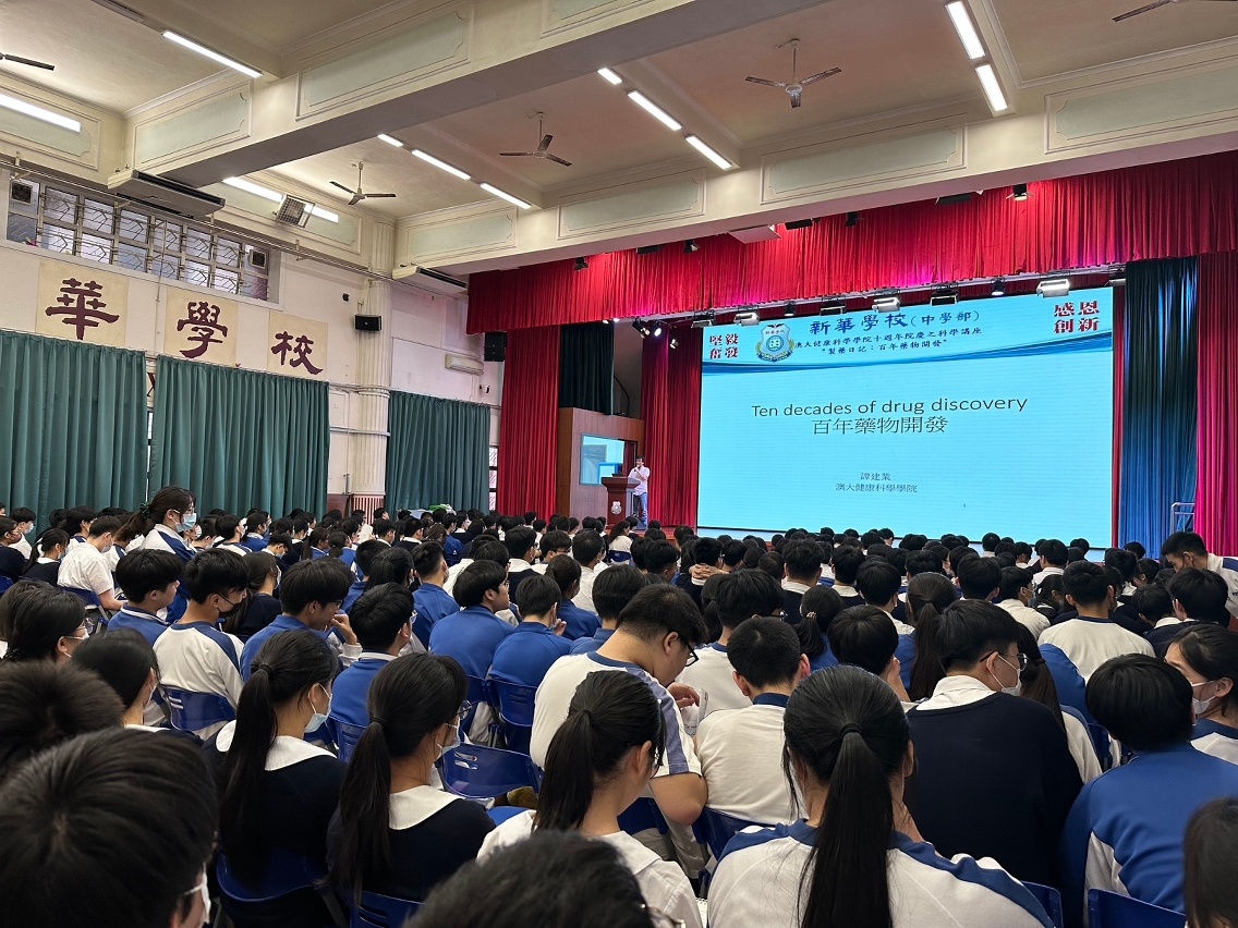 On the occasion of the tenth anniversary of the University of Macau (UM) Faculty of Health Sciences (FHS), Associate Professor Tam Kin Yip and Research Assistant Professor Li Bei in the FHS gave talks on ‘Pharmaceutical Century – Ten Decades of Drug Discovery’ and ‘Body Chemistry Balance’, respectively, to over 300 students at Xin Hua School to enrich their knowledge and broaden their horizons in science.