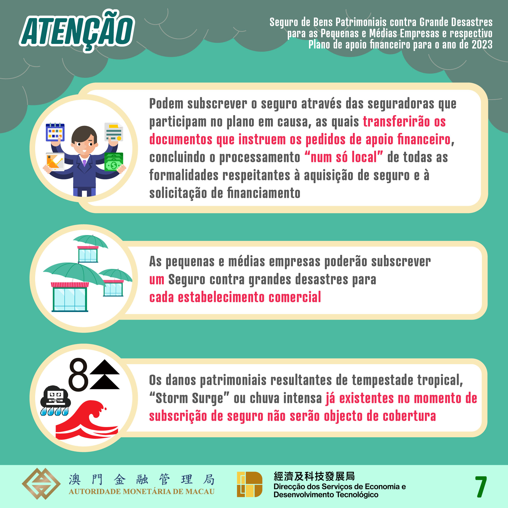 A página oficial da AMCM foi actualizada, constando informações detalhadas relativas ao “Seguro contra grandes desastres” para o ano de 2023, a lista das seguradoras autorizadas para prestar o referido seguro, bem como as informações sobre o Plano de apoio financeiro (https://www.amcm.gov.mo/pt/insurance-sector/sme-catastrophe-property-insurance?type=SME-Catastrophe-Property-Insurance-and-Subsidy-Scheme ). Para prestação de quaisquer esclarecimentos sobre o “Seguro contra grandes desastres”, queira, por favor, contactar, directamente as seguradoras em apreço, ou solicitar, durante o horário de expediente, informações sobre os seguintes assuntos junto da respectiva entidade competente: