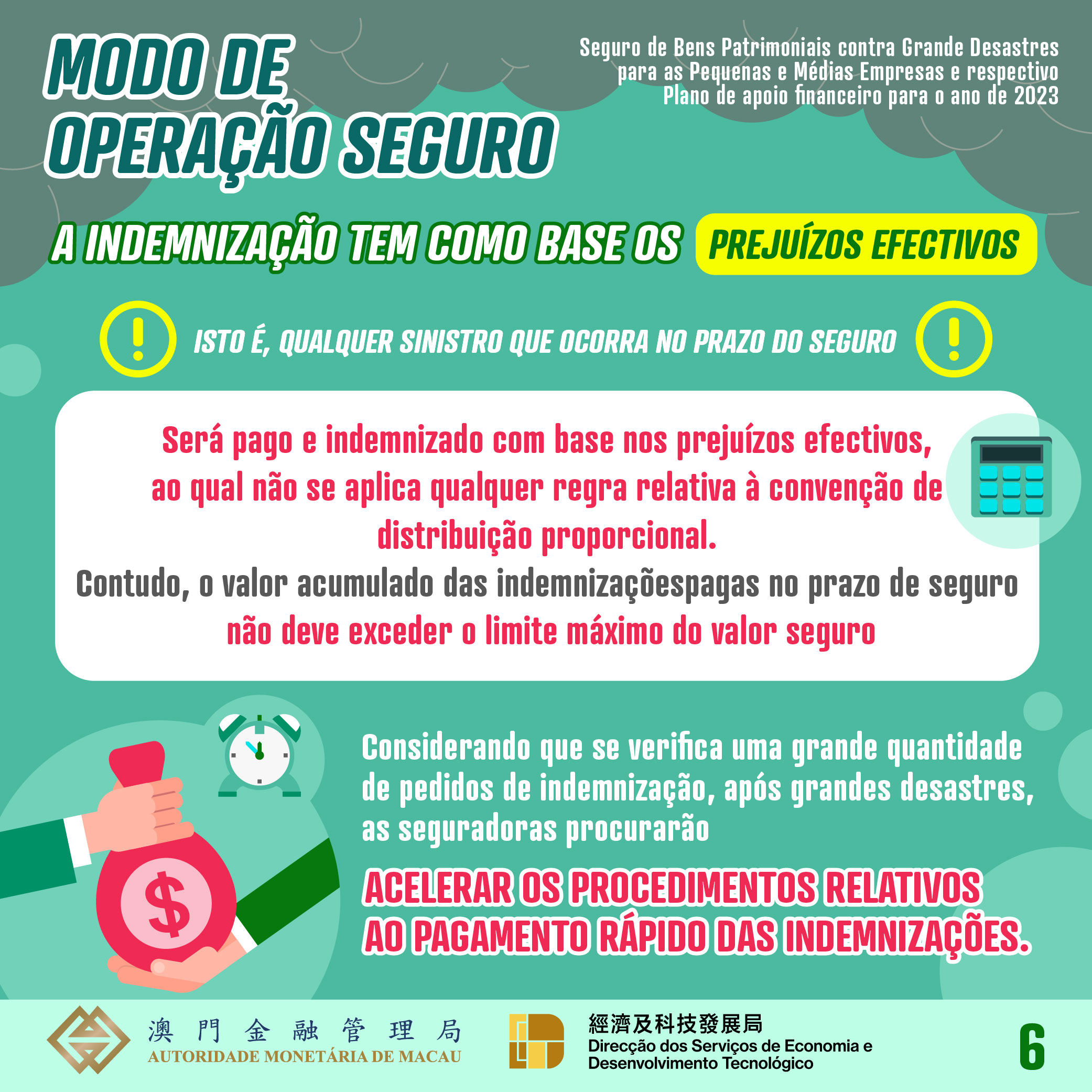 No período compreendido entre a data de hoje e até a 29 de Dezembro de 2023, as PMEs podem subscrever um “Seguro contra grandes desastres” para cada estabelecimento comercial, através das cinco seguradoras de Macau, participantes no plano supramencionado para o ano de 2023. Para além dos valores seguros estabelecidos nos anos anteriores, de MOP100.000, MOP200.000 e MOP300.000, será adicionada uma nova opção de cobertura de MOP500.000 para este ano, permitindo aos comerciantes optarem por adquirir uma cobertura maior. A taxa de prémio foi reduzida, de forma cabal, de 40% para 15% em todos os casos, sendo os prémios correspondentes aos montantes de cobertura acima referidos de MOP15.000, MOP30.000, MOP45.000 e MOP75.000.