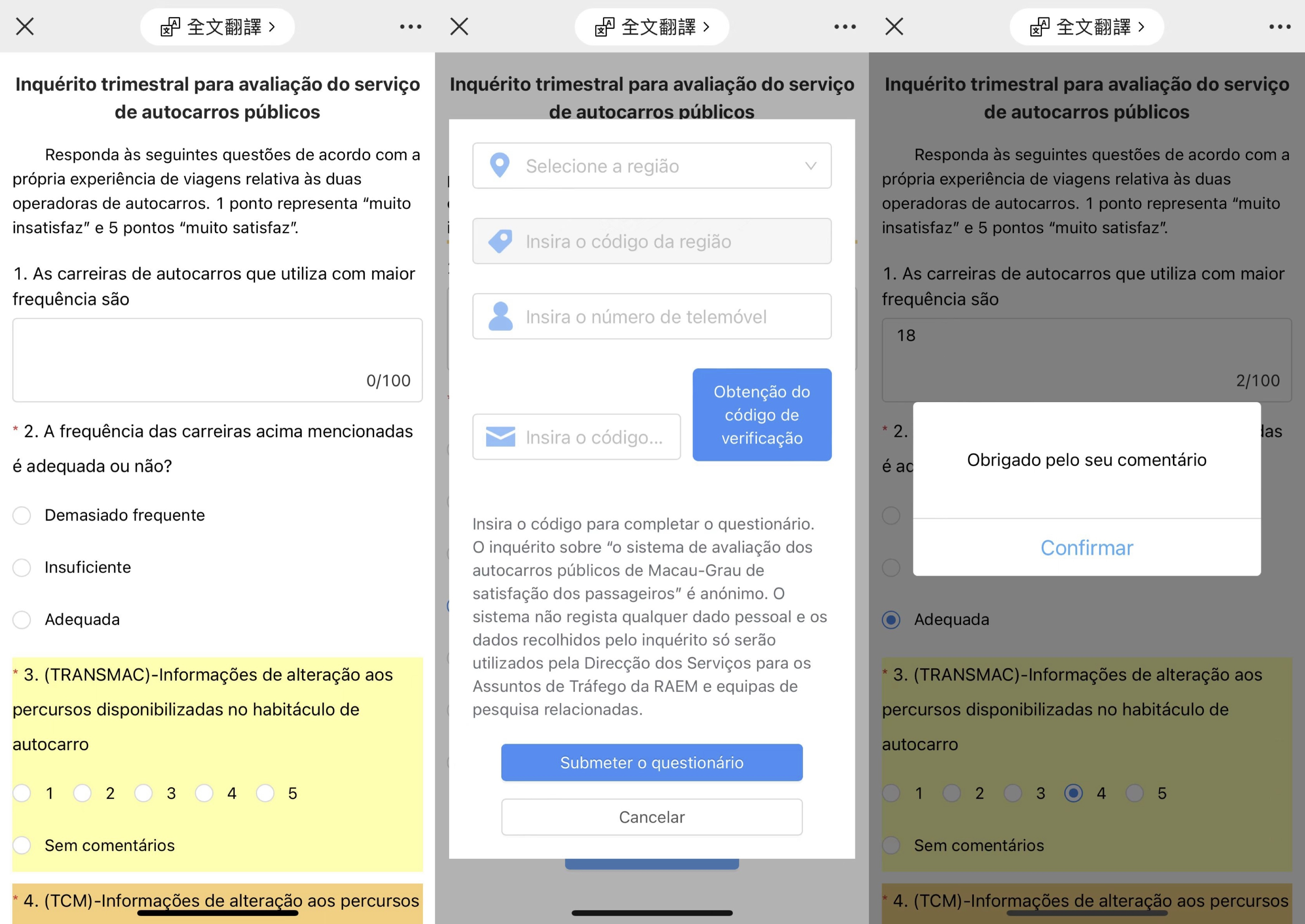 • Interface do inquérito trimestral de avaliação do serviço de autocarros públicos na aplicação móvel“localização dos autocarros”