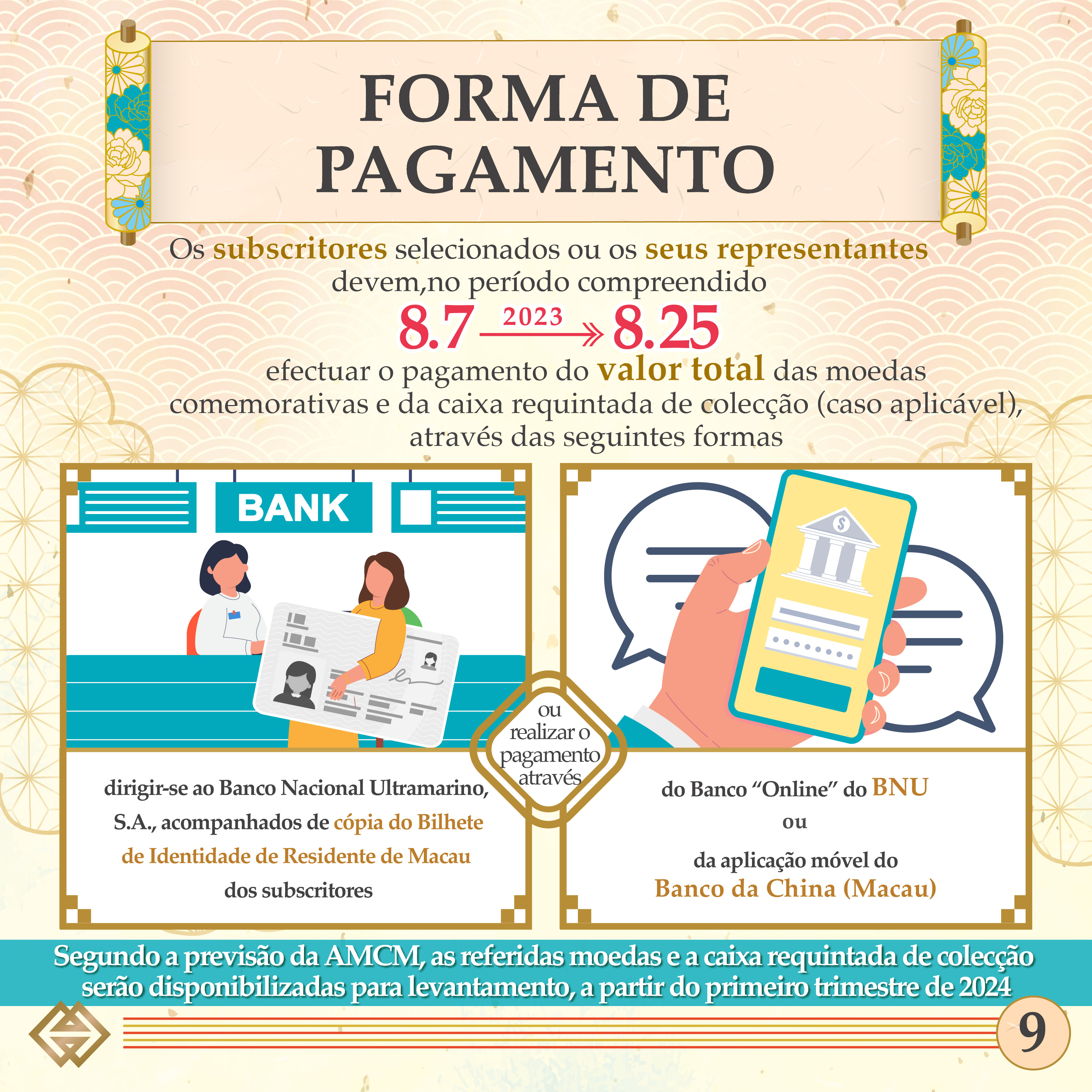 Os subscritores selecionados ou os seus representantes devem efectuar o pagamento do valor total das moedas comemorativas e da caixa requintada de colecção (caso aplicável), através de “banco online” do Banco Nacional Ultramarino, S.A. (BNU) ou “Banco da China (Macau) Aplicação no telemóvel” ou dirigir-se às agências do BNU, acompanhados de cópia do Bilhete de Identidade de Residente de Macau dos subscritores, no período compreendido entre 7 a 25 de Agosto de 2023. As moedas comemorativas e a caixa requintada de colecção serão disponibilizadas para levantamento, a partir do primeiro trimestre de 2024, segundo a previsão da AMCM. Para prestação de informações detalhadas acerca do processo de subscrição destas moedas comemorativas e da caixa requintada de colecção, por favor queiram consultar o “website” da AMCM ou contactar a AMCM telefonicamente (2856 5071 ou 2856 5072).