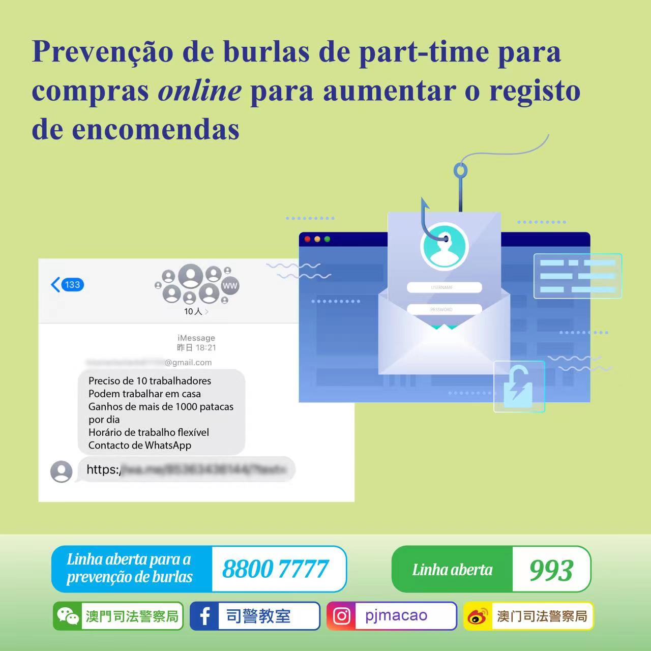 A PJ recebeu denúncias, nos últimos dias, referentes a mensagens que os burlões enviaram através da rede do smartphone onde faziam anúncio de recrutamento para trabalho em part-time para fazer aumentar o registo de encomendas através de compras online. Segundo o anúncio, o trabalhador poderá trabalhar em casa e ganhar mais de mil patacas por dia. O conteúdo de trabalho é ajudar “lojista na rede” fazendo aumentar a quantidade de gosto. Para isso, pedia-se às vítimas foram que  fizessem compras na plataforma indicada, devendo fazer primeiro o pagamento com o seu próprio dinheiro até se atingir um valor especificado. Entretanto, ao atingir-se o valor exigido, ser-lhes-ia devolvido o dinheiro juntamente com a comissão. Somente quando a vítima aumentou o valor de compras e não conseguiu receber o dinheiro é que reconheceu ter caído numa armadilha lançada por burlões.