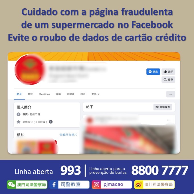 O Centro de Coordenação de Combate às Burlas da Divisão de Investigação de Crimes Informáticos da PJ descobriu hoje, na rede social, uma página fraudulenta de um grande supermercado de Macau.