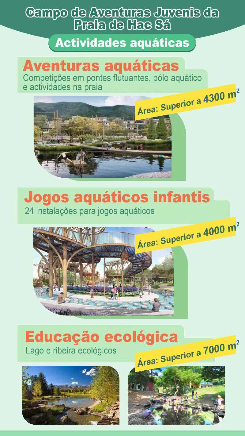 O Campo de Aventuras Juvenis da Praia de Hac Sá, com uma área total de 10 hectares, além de contar com 12 áreas funcionais temáticas e mais de 200 modalidades de aventura “aquática, terrestre e aérea”, nele será construída uma série de instalações complementares, tais como infra-estruturas de prevenção de inundações e de drenagem, parques de estacionamento, centro de actividades e espaço de restauração, a fim de criar o maior campo de aventuras em Macau e nas regiões vizinhas, oferecendo experiências de aventura “aquática, terrestre e aérea” tridimensional a crianças, adolescentes e jovens.