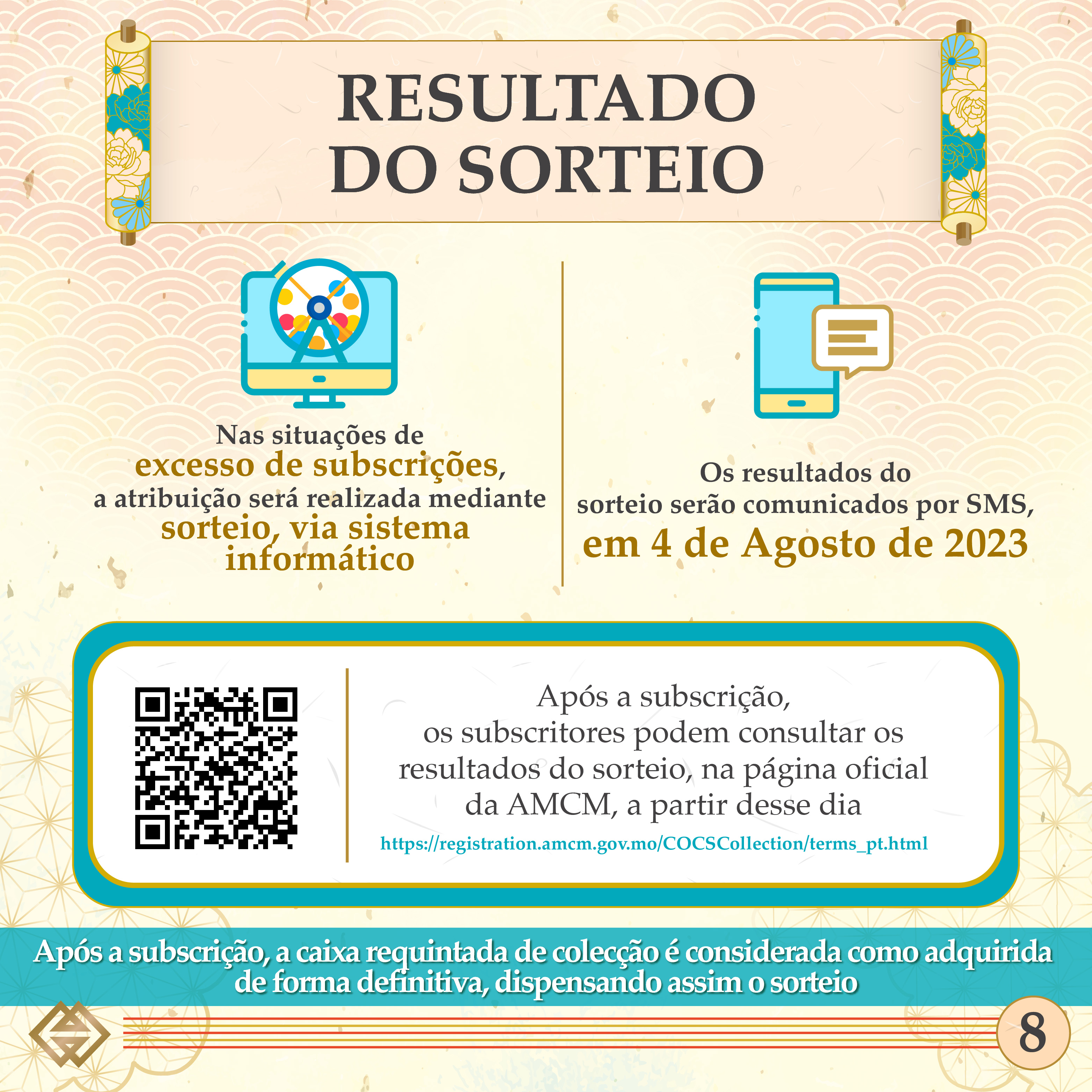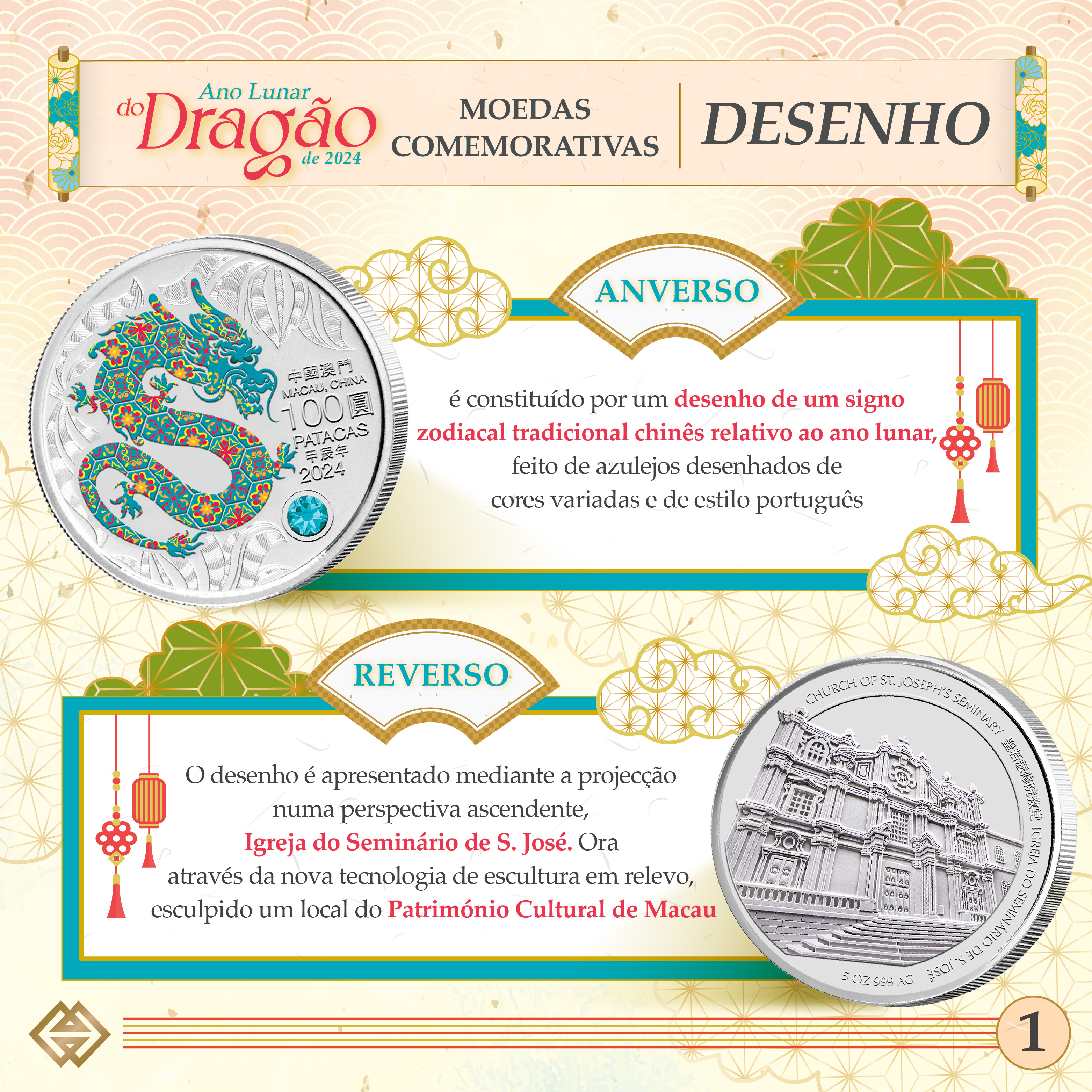 As moedas comemorativas do Ano Lunar do Dragão são constituídas por uma moeda de prata “proof” com 1 onça, uma moeda de prata “proof” com 5 onças e uma moeda de ouro “proof” com 0,5 onça. Nas situações de excesso de subscrições, a atribuição será realizada mediante sorteio, via sistema informático. Os resultados do sorteio serão comunicados por SMS, em 4 de Agosto de 2023. Após a subscrição, os subscritores podem consultar os resultados do sorteio, na página electrónica da AMCM (https://registration.amcm.gov.mo/COCSCollection/terms_pt.html), a partir desse dia. Após a subscrição, a caixa requintada de colecção é considerada como adquirida de forma definitiva, dispensando assim o sorteio.