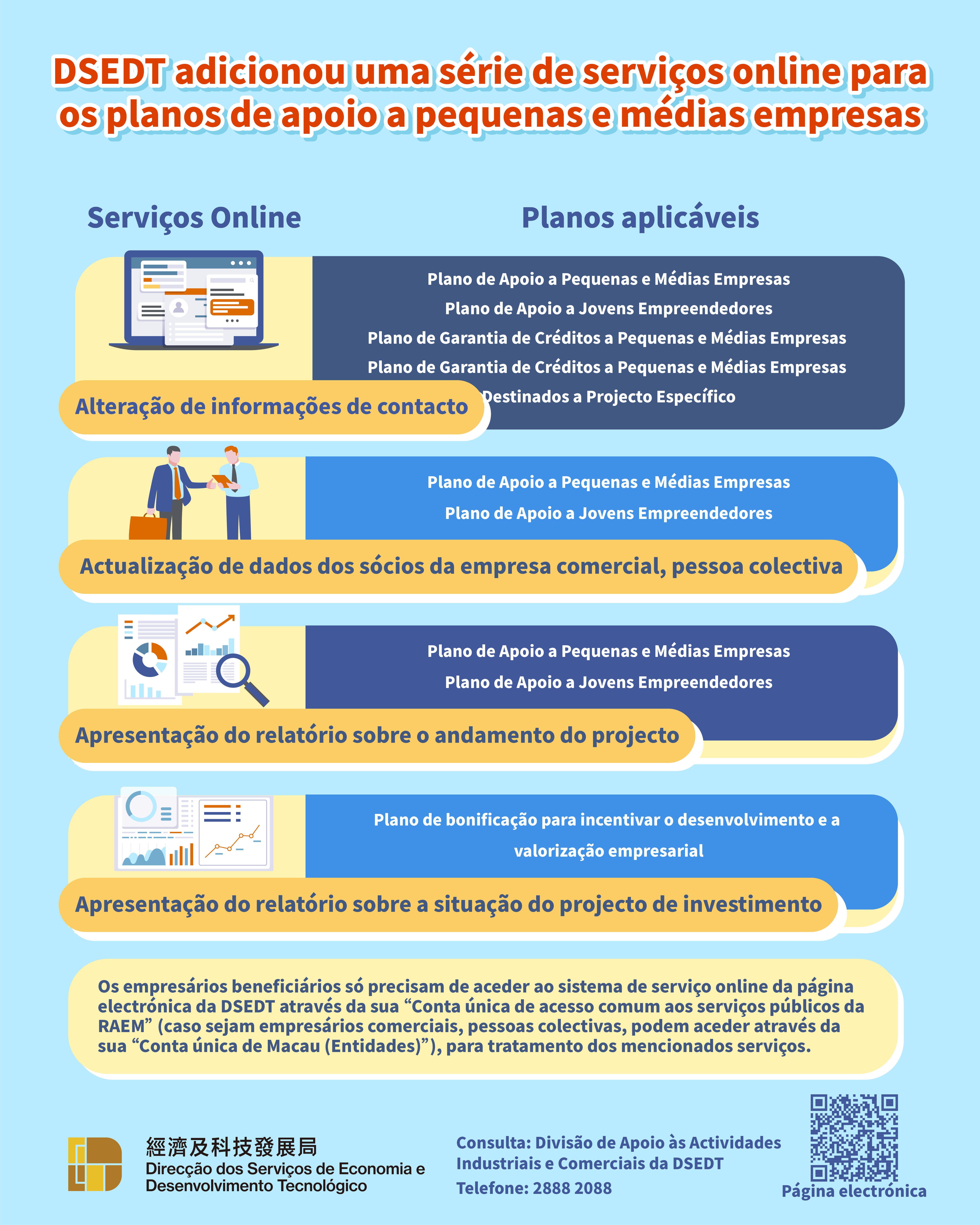 Com vista à optimização contínua do governo electrónico, prestando mais serviços para a comodidade da população e dos comerciantes, a Direcção dos Serviços de Economia e Desenvolvimento Tecnológico (DSEDT) acrescentou, a partir de Julho, vários serviços online (“alteração de informações de contacto”, “actualização de dados dos sócios da empresa comercial, pessoa colectiva”, “apresentação do relatório sobre o andamento do projecto”) para os diversos planos de apoio a pequenas e médias empresas, nomeadamente “Plano de Apoio a Pequenas e Médias Empresas”, “Plano de Apoio a Jovens Empreendedores”, “Plano de Garantia de Créditos a Pequenas e Médias Empresas” e “Plano de Garantia de Créditos a Pequenas e Médias Empresas Destinados a Projecto Específico”, tendo ainda acrescentado o serviço online “apresentação do relatório sobre a situação do projecto de investimento” para o “Plano de bonificação para incentivar o desenvolvimento e a valorização empresarial”.