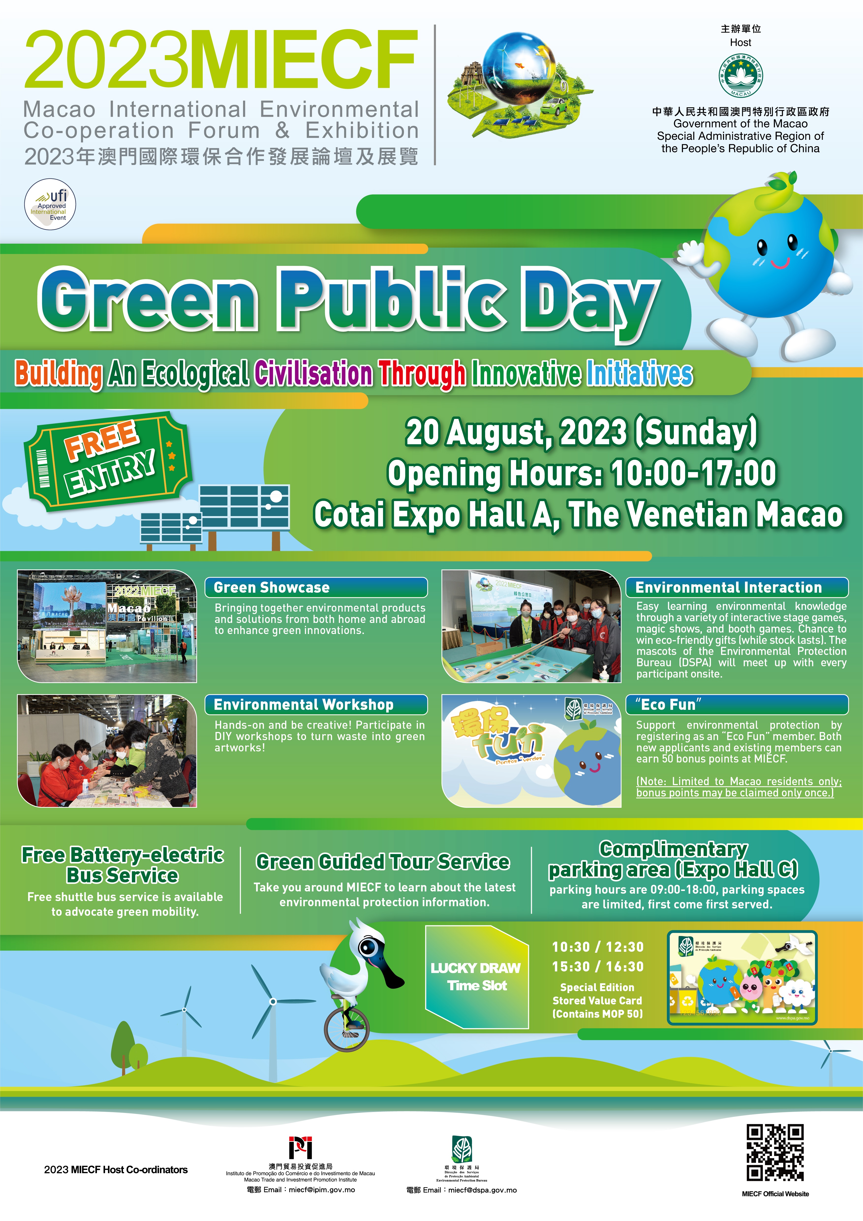 Organizado pelo Governo da RAEM e realizado pelo Instituto de Promoção do Comércio e do Investimento de Macau (IPIM) em conjunto com a Direcção dos Serviços de Protecção Ambiental (DSPA), o Fórum e Exposição Internacional de Cooperação Ambiental de Macau 2023 (doravante designado por “2023MIECF”) terá lugar nos dias 17 a 20 de Agosto, no Cotai Expo, The Venetian Macao, sendo o tema desta edição “Iniciativas Inovadoras para a Construção de uma Civilização Ecológica”. O evento é aberto ao público para visitas gratuitas durante o fim-de-semana e, no “Dia Verde do Público”, que está marcado para o último dia (20 de Agosto) do evento, o público pode visitar a Mostra Verde e participar nas actividades de sensibilização e educação ambiental, para conhecer as informações e tecnologias mais recentes na área de protecção ambiental e elevar a sua consciência ambiental.