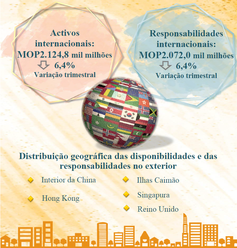 A actividade bancária internacional de Macau distribuiu-se principalmente pela Ásia. Até final de Junho de 2023 as quotas das disponibilidades do sistema bancário de Macau no Interior da China e em Hong Kong, foram de 40,5% e 26,1%, respectivamente, no total de activo exterior. Entretanto, as quotas das disponibilidades nos países de língua portuguesa e nos países localizados ao longo da iniciativa “Uma Faixa, Uma Rota” ocuparam 0,8% e 11,0%, respectivamente. Quanto ao passivo sobre o exterior, registaram quotas de 42,6% e 37,9% para Hong Kong e o Interior da China, respectivamente, do total de passivo sobre o exterior. Relativamente aos países de língua portuguesa e aos países localizados ao longo da iniciativa “Uma Faixa, Uma Rota” registaram quotas de 0,6% e 6,8%, respectivamente.