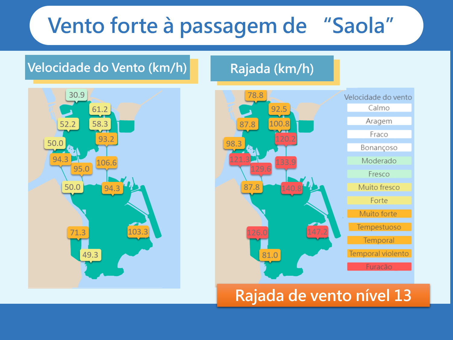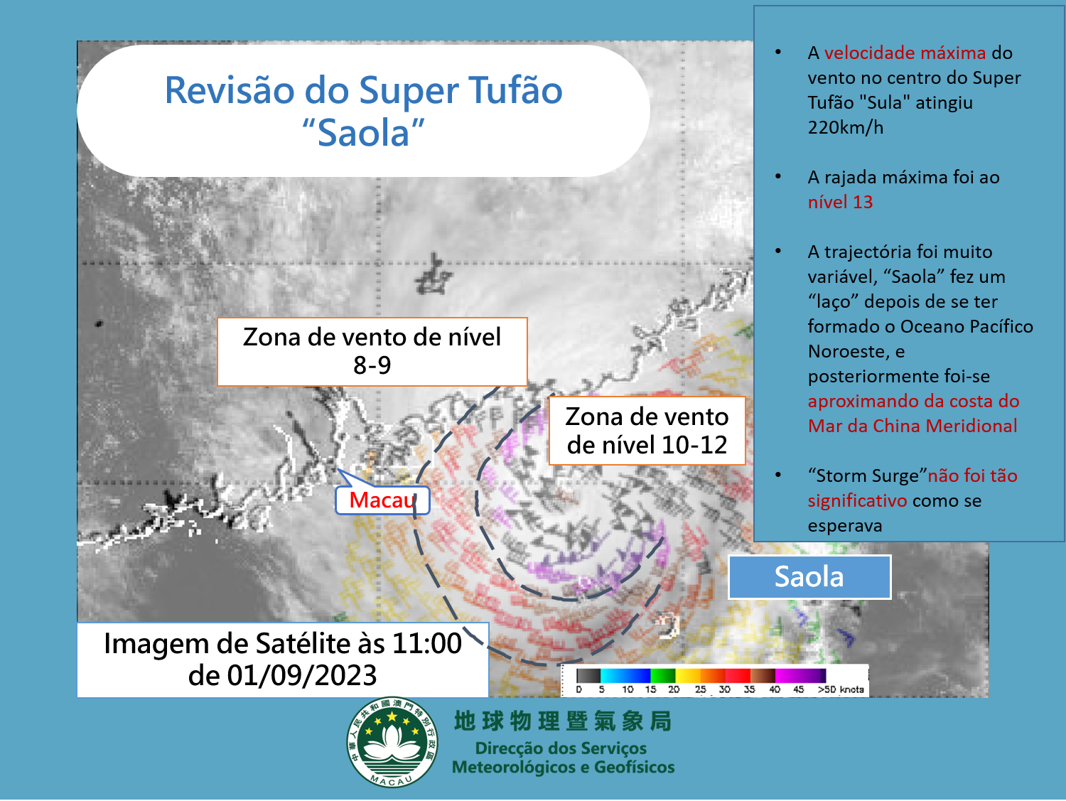 O tufão "Saola" foi o primeiro sinal n.o 10 de tempestade tropical para Macau nos últimos três anos. À medida que "Saola" se afasta e enfraquece, gradualmente, esta Direcção emitiu o sinal n. o 3 para substituição o sinal n. o 8SE pelas 15:00 horas de hoje (dia 2).