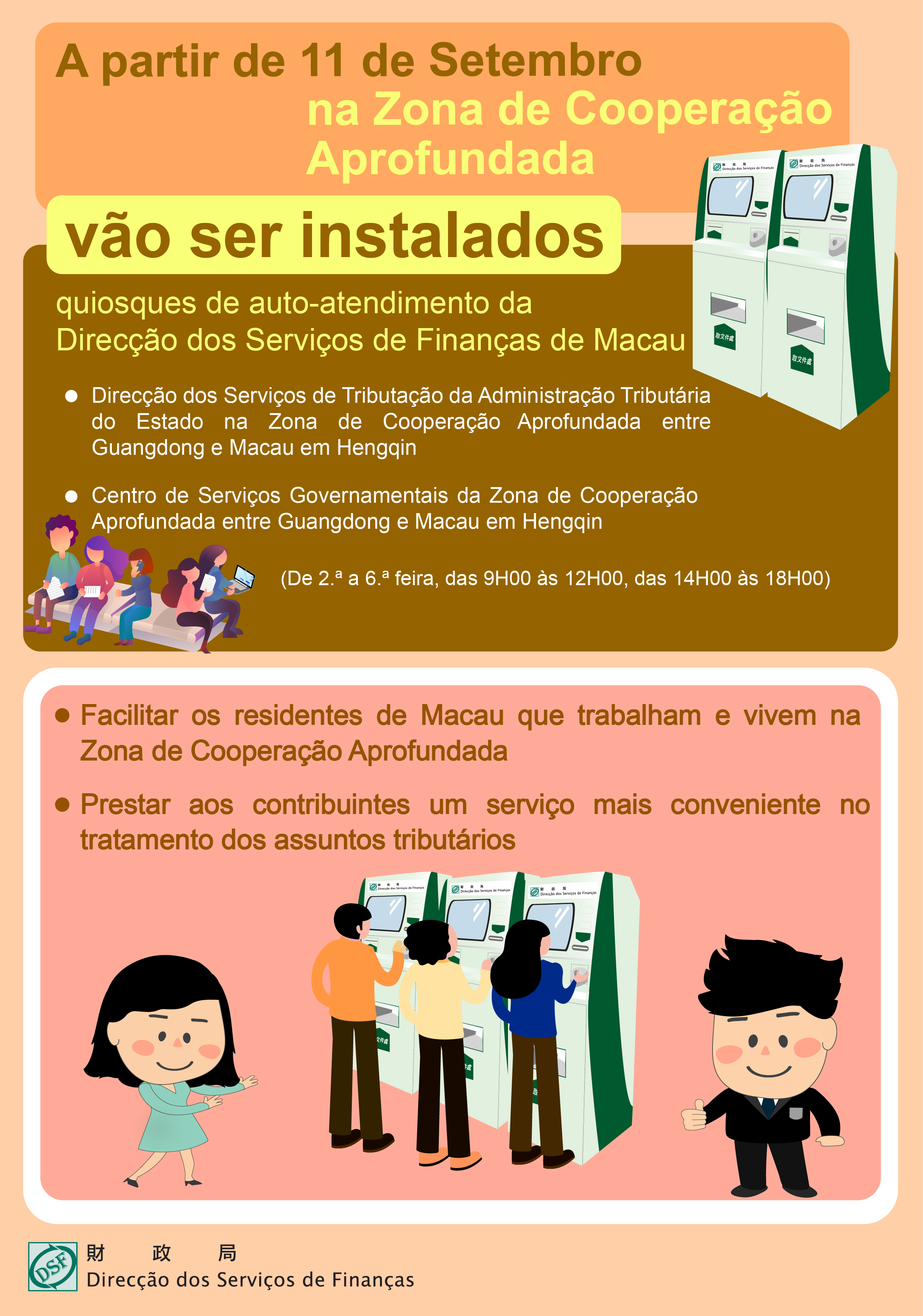 Com o apoio e a colaboração por parte da Direcção dos Serviços de Assuntos Comerciais e da Direcção dos Serviços de Tributação da Administração Tributária do Estado na Zona de Cooperação Aprofundada entre Guangdong e Macau em Hengqin, encontram-se instalados, na Direcção dos Serviços de Tributação e no Centro de Serviços Governamentais da Zona de Cooperação Aprofundada, respectivamente, Quiosques de Auto-Atendimento da DSF que permitem facilitar aos contribuintes o tratamento das respectivas formalidades fiscais, designadamente: o acesso aos serviços de consulta fiscal em sede do Imposto Profissional e do Imposto Complementar de Rendimentos, a alteração dos meios de contacto para efeitos fiscais, a verificação da situação individual no âmbito da dívida, e a apresentação da Relação Nominal M3/M4 do Imposto Profissional.