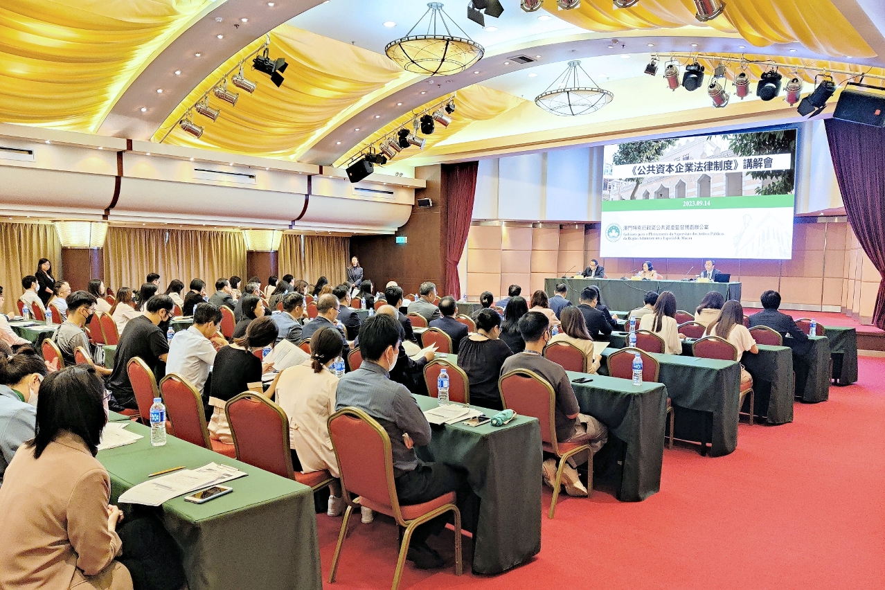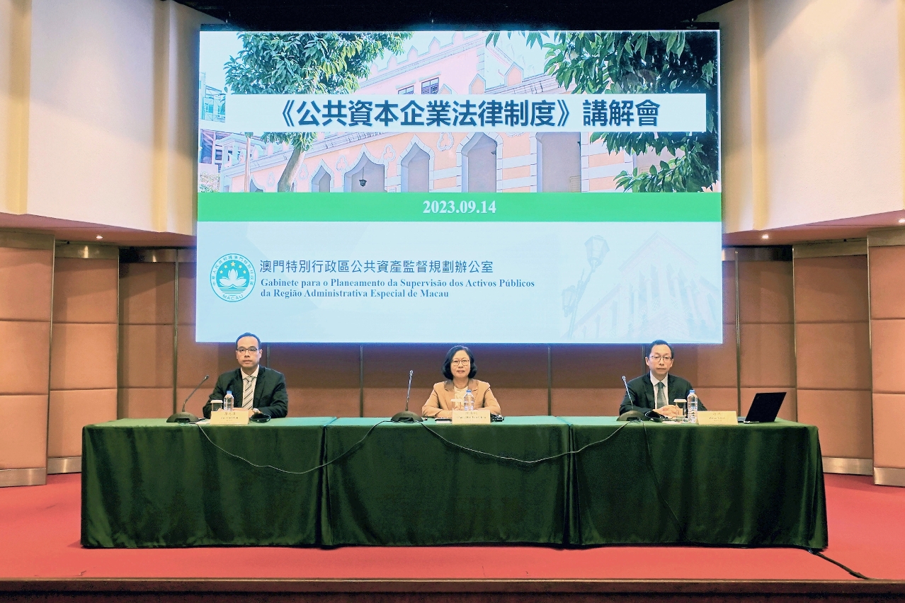A Lei n.º 16/2023 (Regime jurídico das empresas de capitais públicos) entrará em vigor no dia 1 de Novembro do corrente ano. Para aprofundar o conhecimento e a compreensão das empresas de capitais públicos sobre o Regime jurídico das empresas de capitais públicos, em 14 de Setembro, pelas 10h00 da manhã, no Salão de Lótus do Edifício World Trade Centre (5.º andar), o Gabinete para o Planeamento da Supervisão dos Activos Públicos da Região Administrativa Especial de Macau, doravante designado por GPSAP, realizou a “Sessão de esclarecimento sobre o Regime jurídico das empresas de capitais públicos”, presidida pela coordenadora do GPSAP, Sónia Chan, contando com a participação de mais de 90 representantes das empresas de capitais públicos de Macau.