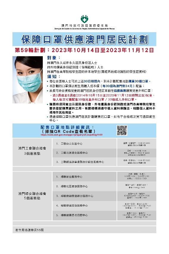 Os Serviços de Saúde informam hoje (dia 11) que, será lançado o 59.º Programa de fornecimento de máscaras aos residentes de Macau a partir de 14 de Outubro de 2023, conforme a seguir discriminado: