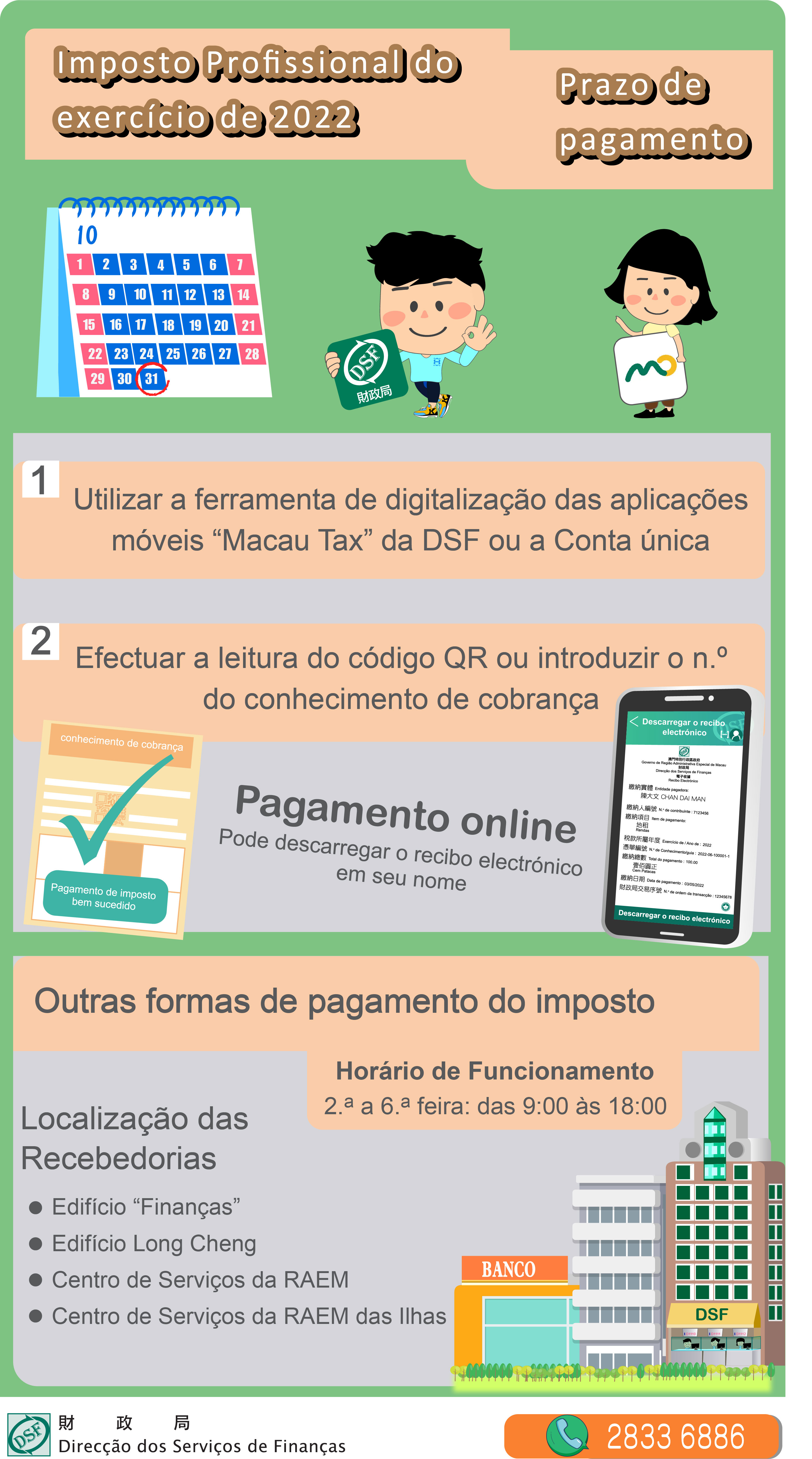 Os contribuintes, através da ferramenta de digitalização das aplicações móveis “Macau Tax” da DSF ou a Conta única, podem efectuar a leitura do código QR do conhecimento de cobrança ou introduzir o n.º do conhecimento, para ligar-se à plataforma de pagamento móvel “GovPay” e pagar directamente o imposto. Para além do pagamento de impostos através dos meios electrónicos supramencionados, podem ainda, consultar e proceder ao descarregamento imediato do recibo electrónico em seu nome.