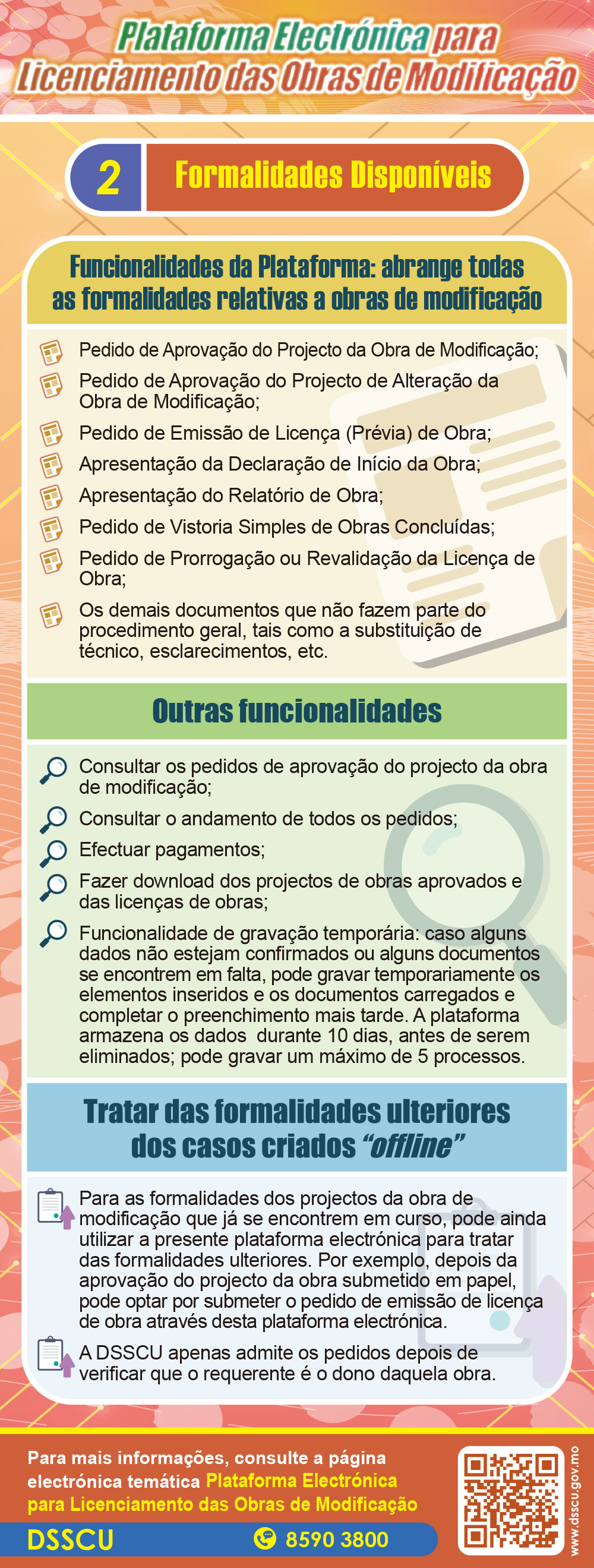 Esta Plataforma abrange todas as formalidades relativas a obras de modificação. Os dados e os documentos submetidos nesta Plataforma e offline são quase iguais. Todos os ficheiros submetidos devem ser apresentados em formato PDF. Além disso, para impulsionar o sector, pode-se ainda utilizar esta Plataforma para tratar das formalidades ulteriores das obras de modificação que já se encontram em curso. Por exemplo, depois da aprovação do projecto da obra submetido em papel, pode optar por submeter o pedido de emissão da licença de obra através desta Plataforma. Esta dispõe também da funcionalidade de gravação temporária,  no prazo de 10 dias, os elementos inseridos e os documentos carregados para completar o preenchimento mais tarde.