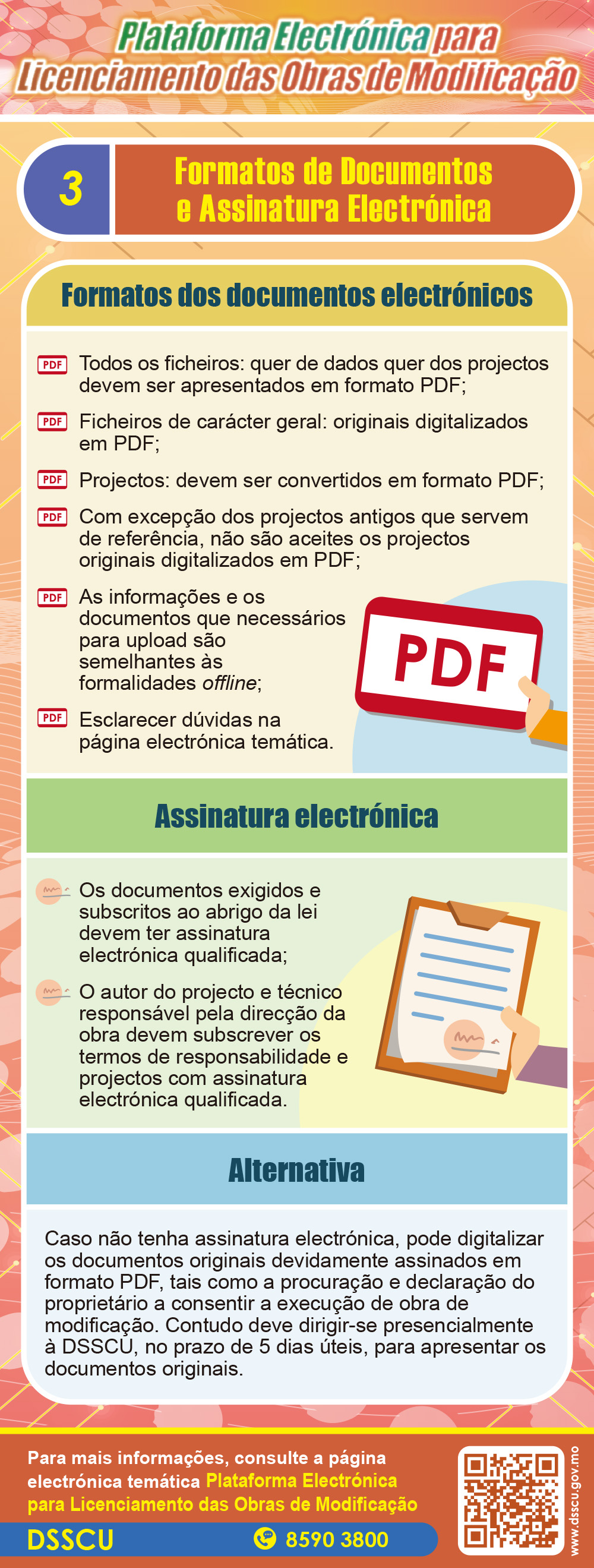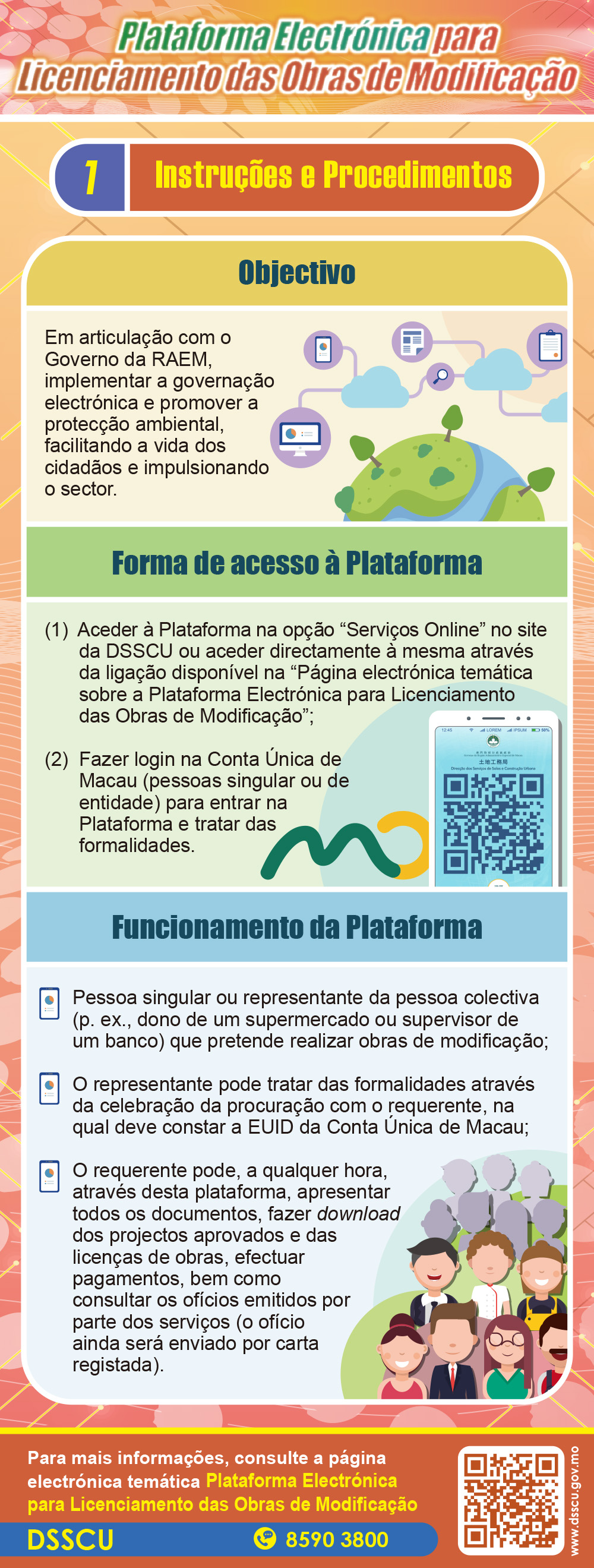 O licenciamento das obras de modificação é a primeira fase da implementação da apresentação de projectos por via electrónica da DSSCU, em articulação com os trabalhos de governação electrónica do Governo da RAEM, pretende-se promover a protecção ambiental, facilitar a vida dos cidadãos e impulsionar o sector. O requerente pode, a qualquer hora, através desta Plataforma, apresentar todos os documentos, preencher os elementos complementares, fazer download dos projectos aprovados e das licenças de obras, efectuar pagamentos, etc., assim como consultar os ofícios de resposta e outros documentos emitidos por parte destes Serviços (os ofícios formais ainda são enviados por carta registada). A DSSCU alerta que para a utilização da Plataforma, é necessário abrir a Conta Única de Macau de pessoa singular ou de entidade, sendo que os documentos exigidos e subscritos ao abrigo das leis devem ter assinatura electrónica qualificada.