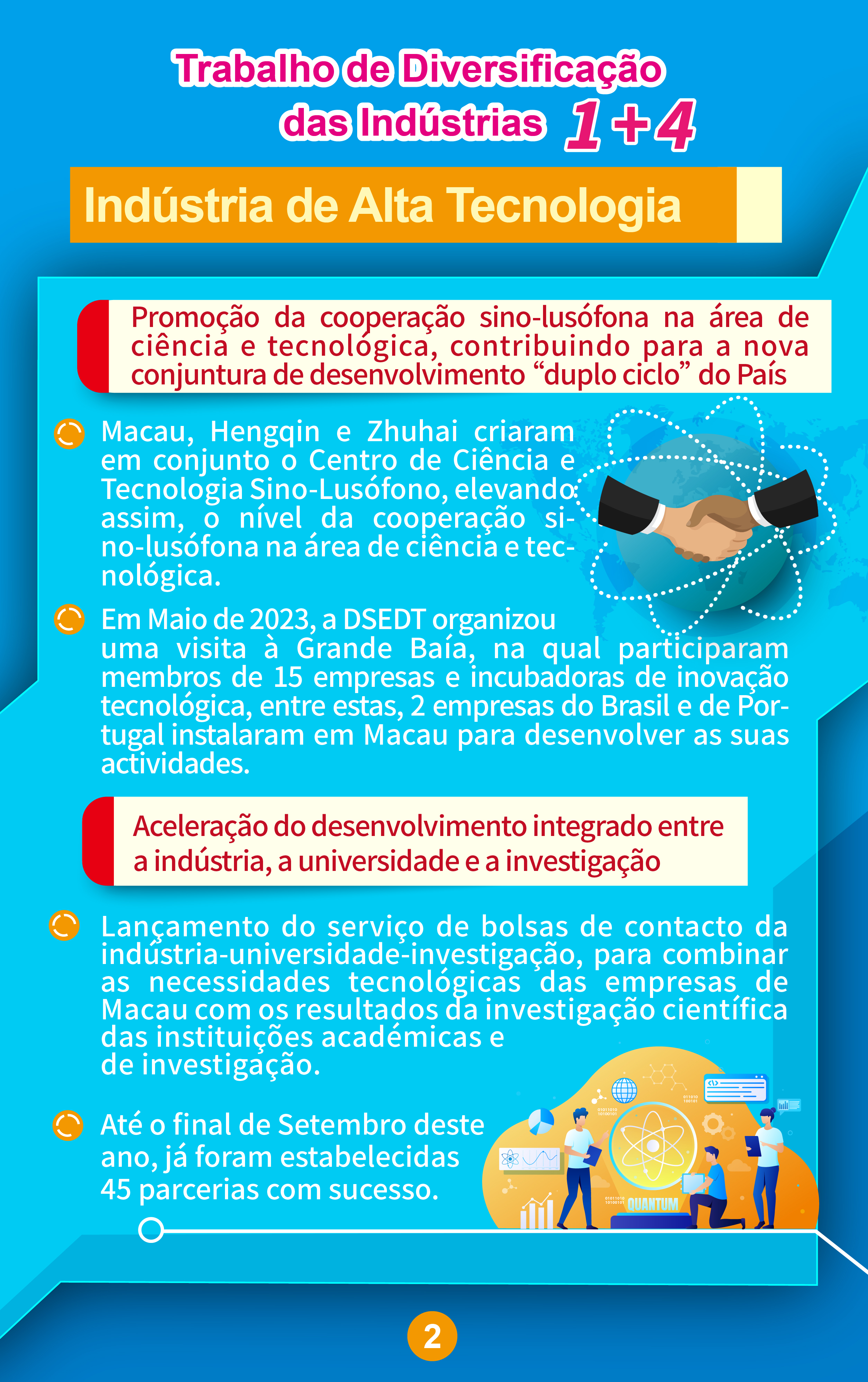 Em Maio deste ano, a DSEDT organizou a “Delegação de empresas científicas e tecnológicas dos Países de Língua Portuguesa para visita à Grande Baía Guangdong-Hong Kong-Macau”, na qual participaram mais de uma dúzia de incubadoras e empresas de ciência e tecnologia do Brasil e de Portugal. Sob a organização da DSEDT, a mesma delegação instalou uma exposição e realizou um roadshow na presente edição da BEYOND EXPO, visitando ainda entidades governamentais, incubadoras e instituições de ensino superior de Macau. Durante a visita em Macau, as duas empresas de tecnologia (de Portugal e do Brasil) trataram das formalidades para a constituição da sua empresa. A delegação visitou também Hengqin, Zhuhai e Guangzhou, no intuito de conhecer o ambiente de negócios e as vantagens das políticas de Macau e do Interior da China.