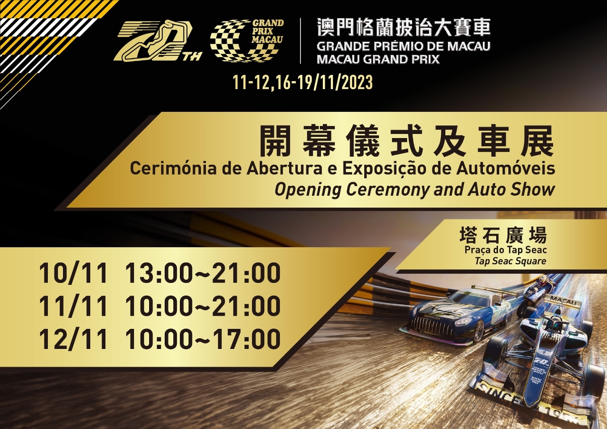 O 70º Grande Prémio de Macau decorrerá de 11 a 12 e de 16 a 19 de Novembro. Permitindo que os residentes e os visitantes vivam a atmosfera emocionante do Grande Prémio, a Comissão Organizadora do Grande Prémio de Macau promove nos dias 10 e 12 de Novembro (sexta-feira a domingo), na Praça do Tap Seac, a Exposição de Automóveis do Grande Prémio, onde se poderão apreciar as grandes máquinas em prova na edição deste ano.