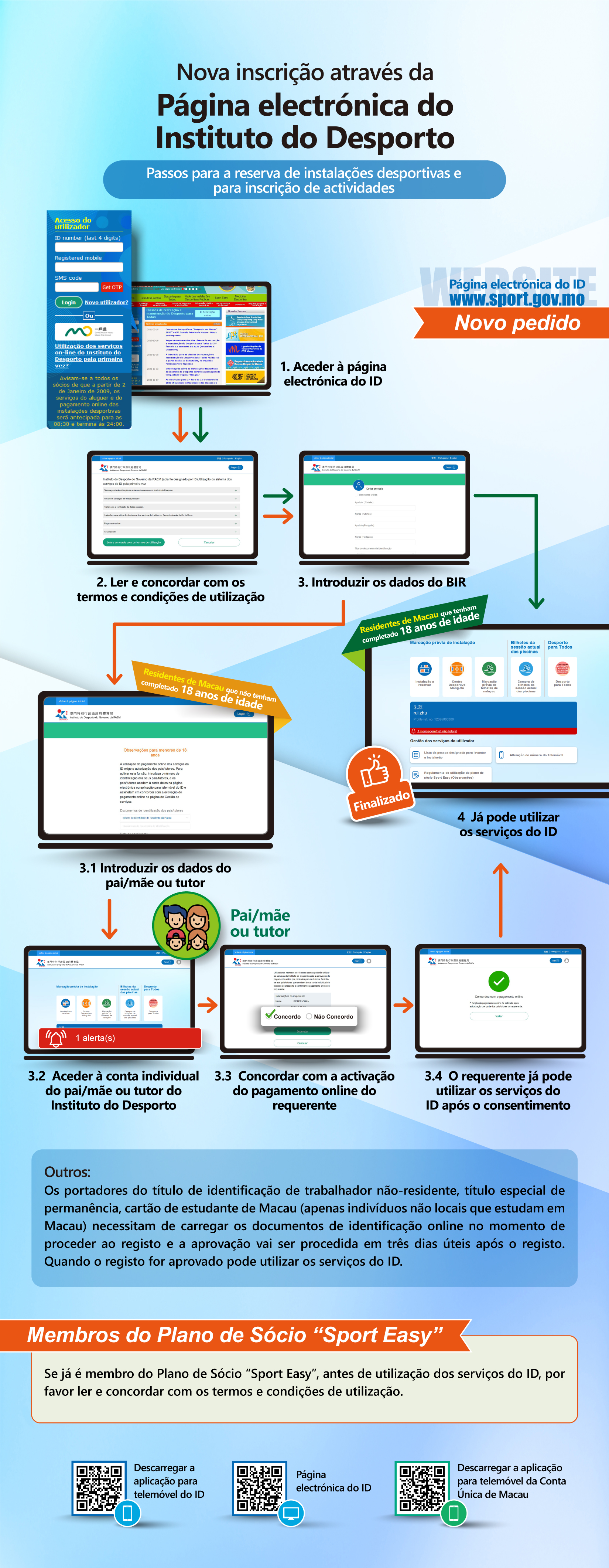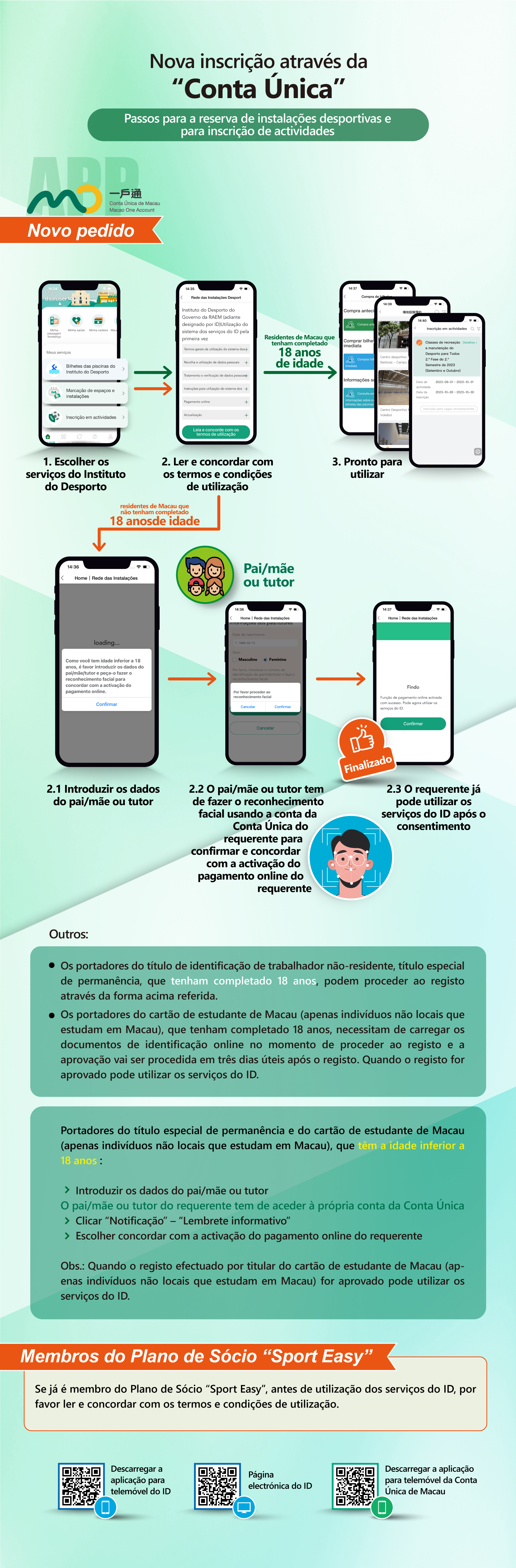 A partir de 22 de Novembro, os residentes só necessitam de seguir os passos online usando o seu documento de identificação (em anexo), não sendo necessário o requerente fazê-lo pessoalmente, nem ter cartão de sócio “Sport Easy” para poder usufruir dos serviços do ID, nomeadamente, compra antecipada online de bilhetes para entrada nas piscina, compra online de bilhetes para entrada imediata nas piscinas, compra antecipada online de bilhetes de outras instalações desportivas e inscrição nas classes de recreação e manutenção do Desporto para Todos.