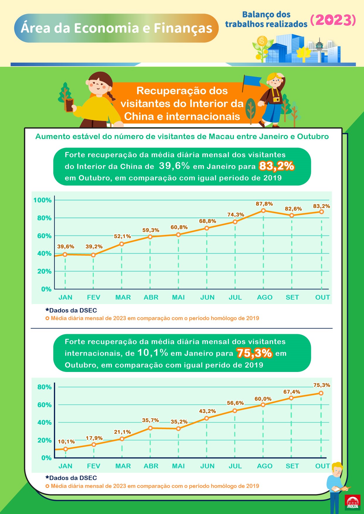 Com a abertura total das fronteiras este ano, a DST tem vindo a promover activamente o turismo de Macau no dentro do país e no exterior. O número de visitantes tem vindo a aumentar de forma estável e a recuperação do turismo e da economia tem sido positiva. De acordo com os dados da Direcção dos Serviços de Estatística e Censos, entre Janeiro e Outubro deste ano, Macau recebeu um total de 22,69 milhões de visitantes, equivalente a uma média de cerca de 75 mil por dia, número que representa uma recuperação de perto de 70% em relação à média diária de todo o ano de 2019. O número de visitantes internacionais nos primeiros dez meses do ano foi de cerca de 1,02 milhões, tendo a média diária de visitantes aumentado de cerca de mil em Janeiro para mais de 5,2 mil em Outubro, um aumento significativo de mais de cinco vezes. Em comparação com o período homólogo de 2019, a taxa média mensal de recuperação dos visitantes internacionais aumentou de 10,1% em Janeiro para 75,3% em Outubro.