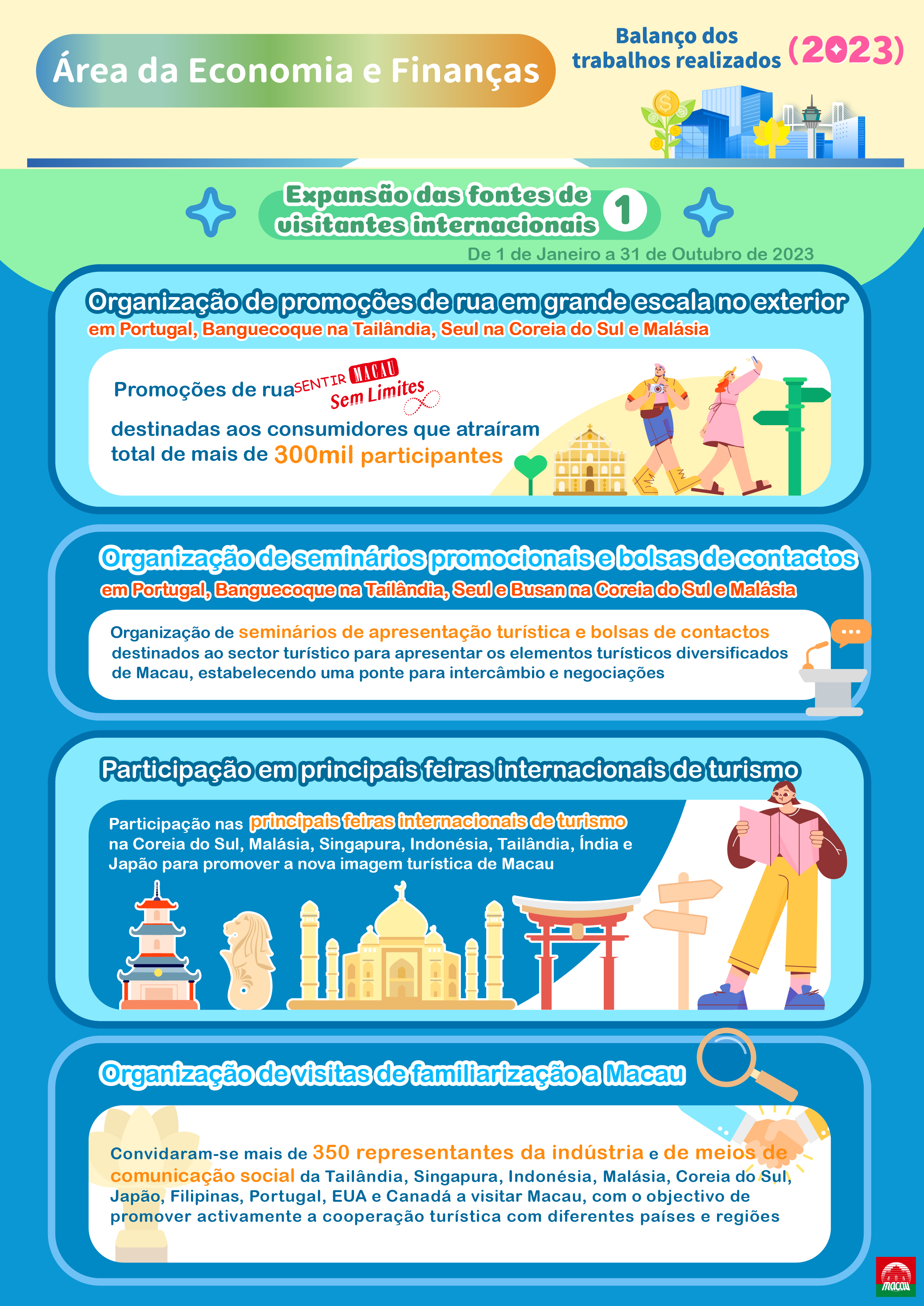 A Direcção dos Serviços de Turismo (DST) continua a aprofundar a integração intersectorial do “turismo +” e a enriquecer os elementos turísticos. Em simultâneo, tem realizado activamente promoções online e presenciais, conjugadas com os grandes eventos de cada mês, e cooperado com os operadores turísticos para expandir as fontes de visitantes, tendo obtido resultados notáveis até à data.