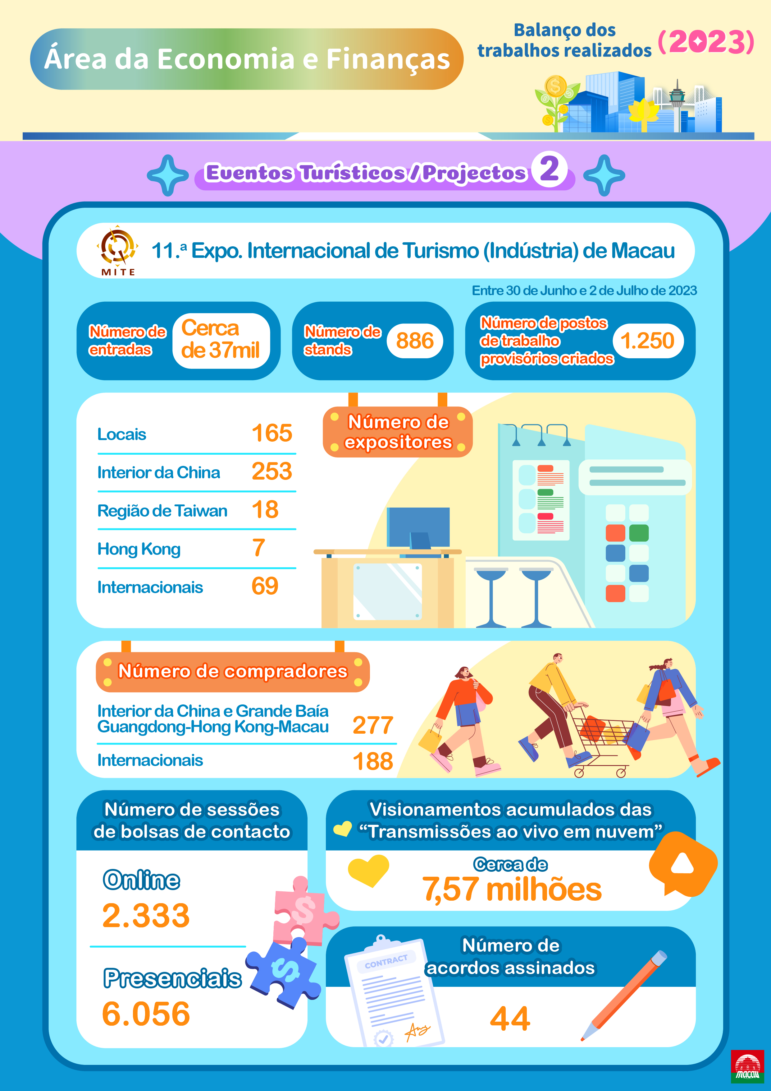 Entre Dezembro do ano passado e Outubro deste ano, a DST organizou quatro grandes eventos emblemáticos de grande escala nocturnos, que atraíram mais de 7,24 milhões de participantes. Através do seu plano específico de apoio financeiro, a DST incentivou ainda as associações a aproveitar os recursos turísticos característicos de cada zona para a realização de actividades turísticas diversificadas. O Museu do Grande Prémio de Macau recebeu até Outubro deste ano mais de 110 mil visitantes. A Expo Internacional de Turismo (Indústria) de Macau deste ano atraiu 37 mil visitantes, tendo sido realizadas mais de 8.300 sessões de bolsas de contacto online e presenciais, contribuindo para a assinatura de 44 protocolos.