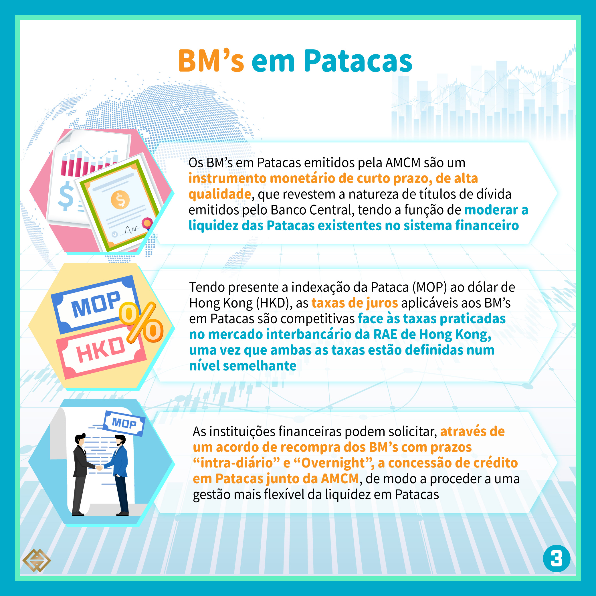 Entre eles, os BM’s emitidos pela AMCM são um instrumento monetário de curto prazo, de alta qualidade, que revestem a natureza de títulos de dívida emitidos pelo Banco Central, tendo a função de moderar a liquidez das Patacas existentes no sistema financeiro. Tendo presente a indexação da Pataca (MOP) ao dólar de Hong Kong (HKD), as taxas de juro aplicáveis aos BM’s são competitivas face às taxas praticadas no mercado interbancário da RAE de Hong Kong, uma vez que ambas as taxas estão definidas num nível semelhante. As instituições financeiras podem solicitar, através de um acordo de recompra dos BM’s com prazos “intra-diário” e “Overnight”, a concessão de crédito em Patacas junto da AMCM, de modo a proceder a uma gestão mais flexível da liquidez em Patacas.