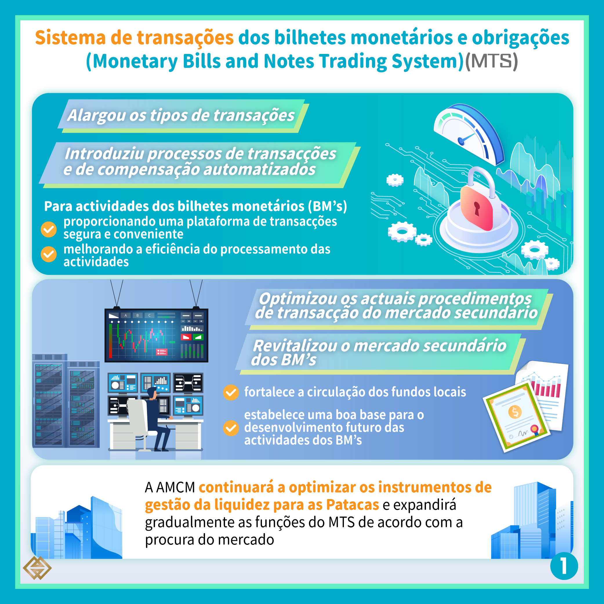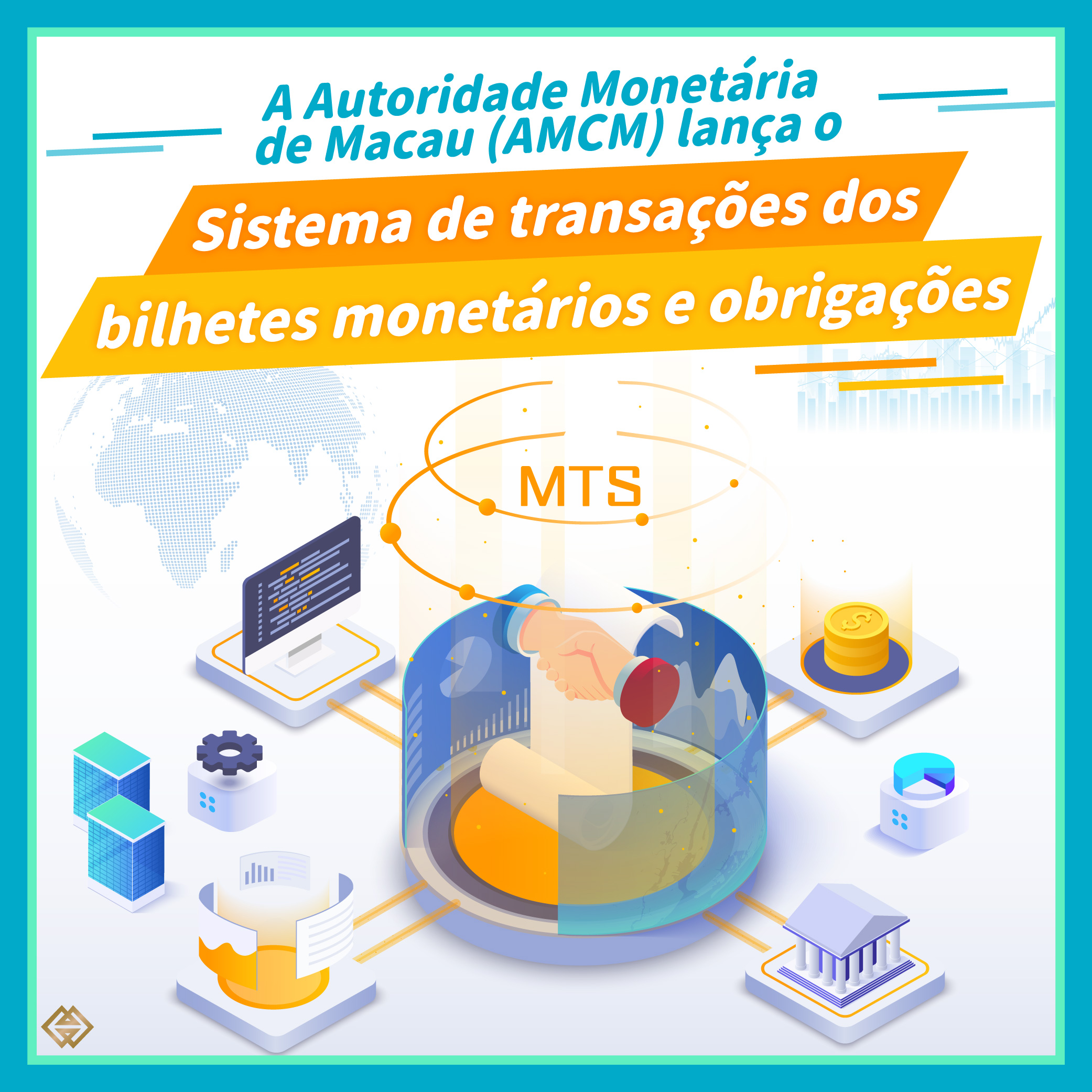 A Autoridade Monetária de Macau (AMCM) concluiu a construção de um novo “Sistema de transações dos bilhetes monetários e obrigações” (“Monetary Bills and Notes Trading System”) (MTS), introduzindo processos de transações e de compensação automatizados para melhorar a eficiência das transações dos bilhetes monetários (BM’s), revitalizar o mercado secundário dos bilhetes monetários, fortalecer a circulação dos fundos locais, bem como promover o uso pelo sector interbancário de instrumentos diversificados do mercado monetário.