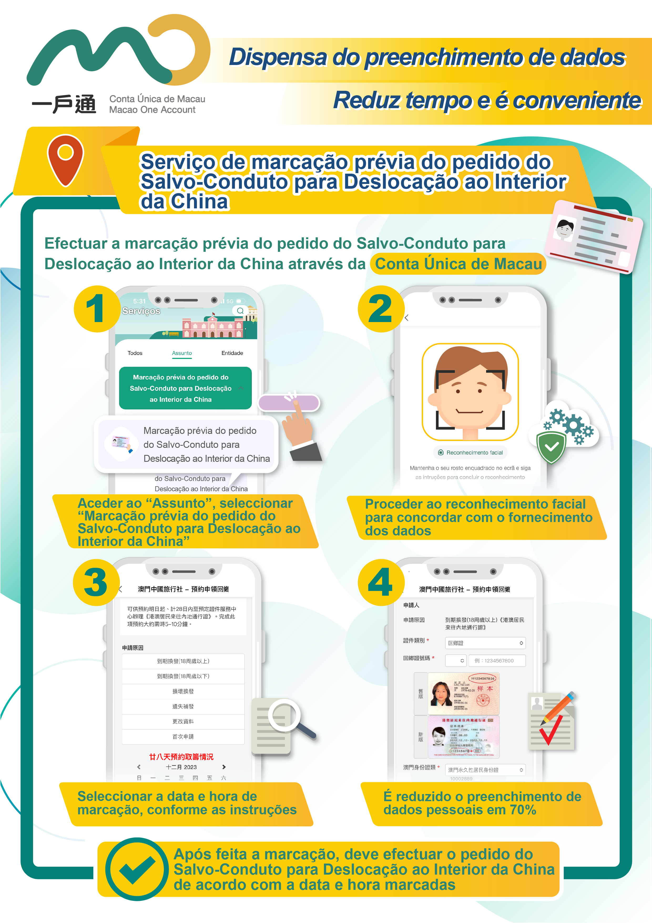 Para facilitar aos residentes a marcação prévia do pedido do Salvo-Conduto para Deslocação ao Interior da China, o Governo coopera com a Agência de Viagens e de Turismo China (Macau), designada pelo Serviço de Controlo Fronteiriço da República Popular da China para atendimento dos pedidos do referido Salvo-Conduto, no sentido de lançar o serviço de marcação prévia do pedido do Salvo-Conduto para Deslocação ao Interior da China na Conta Única de Macau. Os residentes só precisam de aceder ao “Assunto” da Conta Única de Macau, seleccionar “Marcação prévia do pedido do Salvo-Conduto para Deslocação ao Interior da China”, e depois de concordar mediante reconhecimento facial que os respectivos dados pessoais sejam fornecidos para tratar do Salvo-Conduto para Deslocação ao Interior da China, podem seleccionar, conforme instruções, a data de marcação prévia. Uma vez que foram estabelecidas a interconexão e a intercomunicabilidade de dados entre os serviços públicos relevantes através da Conta Única de Macau, pode ser simplificado o processo de introdução de dados no acto de marcação prévia dos residentes, poupando assim significativamente o tempo precioso dos cidadãos, de modo a que a marcação prévia para o pedido do referido Salvo-Conduto seja efectuada de forma mais conveniente, humanizada e rápida.