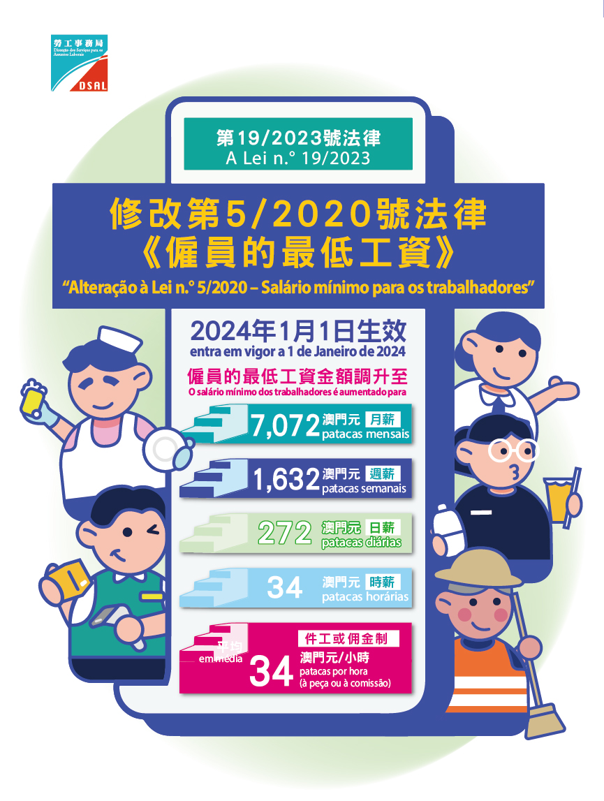 Nos termos do disposto na Lei n.º 5/2020 (Salário mínimo para os trabalhadores), que entrou em vigor no dia 1 de Novembro de 2020, a primeira revisão do valor do salário mínimo ocorre dois anos após a sua entrada em vigor. O Governo da Região Administrativa Especial de Macau já concluiu o trabalho de revisão, tendo alterado os valores do salário mínimo através da Lei n.º 19/2023 (Alteração à Lei n.º 5/2020 ‒ Salário mínimo para os trabalhadores), publicada em 18 de Dezembro de 2023 e, após alteração, o salário mínimo dos trabalhadores terá os seguintes valores:
