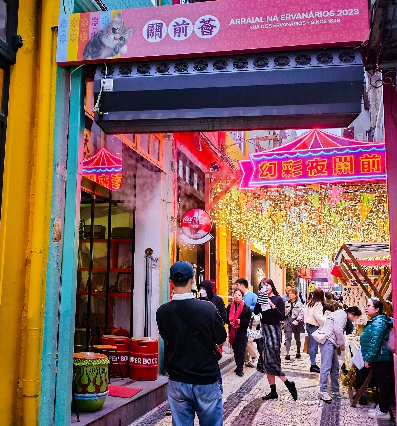 Através do modelo de interacção online e offline, assente em “Atracção de visitantes – experiências - check-in - consumo”, o “Arraial na Ervanários 2023” continuará a levar o fluxo de pessoas aos bairros comunitários e impulsionando, assim, o consumo. Por ocasião da passagem de Natal, Véspera e Dia de Ano Novo, Ano Novo Lunar, entre outras festividades importantes, uma actividade de extensão do “Iluminar Macau 2023” (“Luminescent Night at Travessa do Armazém Velho 2023”) que se realiza no Inverno, embeleza a zona da Rua dos Ervanários com diferentes efeitos de luzes, incluindo os enfeites decorativos de ruas nas zonas de lazer da cidade, paredes decoradas para tirar fotografias, guia de decoração de restaurantes, entre outros, em sintonia com a realização de espectáculos e actividades online e presenciais, dando origem ao encanto nocturno da zona da Rua dos Ervanários.