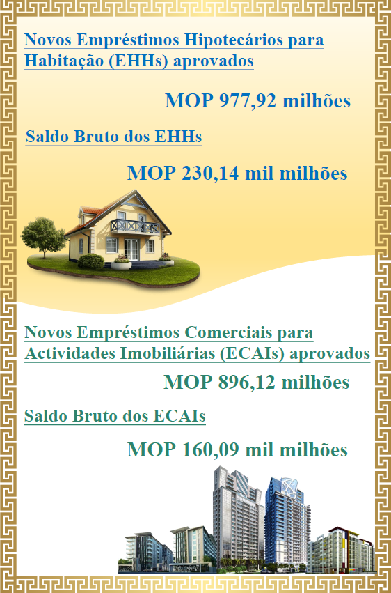 De acordo com as estatísticas publicadas hoje (dia 11) pela AMCM, em Novembro de 2023, os novos empréstimos hipotecários para habitação (EHHs) aprovados registaram crescimento mas os novos empréstimos comerciais para actividades imobiliárias (ECAIs) aprovados registaram decrescimento em relação ao mês anterior. Quanto comparado com o mês anterior, registou-se uma diminuição no saldo bruto dos EHHs e dos ECAIs.