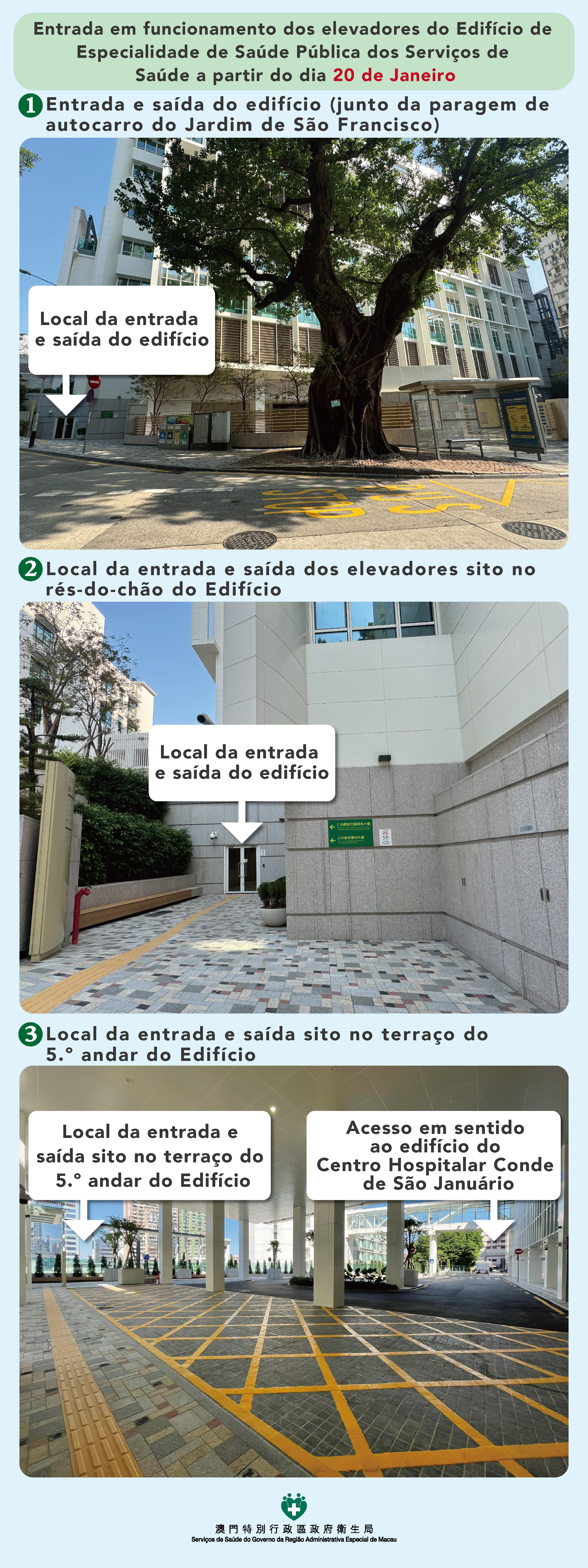 Os elevadores do Edifício de Especialidade de Saúde Pública dos Serviços de Saúde estarão abertos ao público a partir do dia 20 de Janeiro, no sentido de facilitar o acesso dos residentes ao Centro Hospitalar Conde de São Januário. Os residentes podem utilizar o elevador na entrada e saída do rés-do-chão do Edifício de Especialidade de Saúde Pública, situado em frente do Jardim de São Francisco (junto da paragem de autocarro do Jardim de São Francisco), para chegar ao Centro Hospitalar Conde de São Januário, havendo no local placas de indicação.