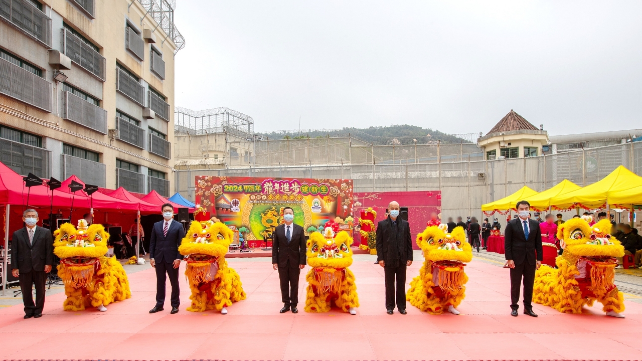 Na manhã do dia 22 de Janeiro, participaram no evento os representantes de vários órgãos do governo e organizações de serviço social e presidiram à cerimónia de vivificação de leões o Director-geral dos Serviços de Alfândega da RAEM, Vong Man Chong, o Presidente do Tribunal de Segunda Instância, Tong Hio Fong, o Chefe do Gabinete do Procurador, Tam Peng Tong, o Secretário-geral da Cáritas de Macau, Paul Pun Chi Meng e o Director da DSC, Cheong Fong Meng. Com o som dos gongos e tambores e a dança de leões auspiciosos, deu-se início oficialmente à primeira sessão da Festa do Ano Novo Lunar. Os programas preparados pelos próprios reclusos foram encenados um após o outro, incluindo teatro de ano novo lunar, ópera de Pequim, Tai Chi Chuan com leque, dança de bate-mesa feminina e apresentações de músicas de sua autoria. As maravilhosas apresentações receberam aplausos constantes dos espectadores e a primeira sessão da festa foi realizada com sucesso em meio de risadas.