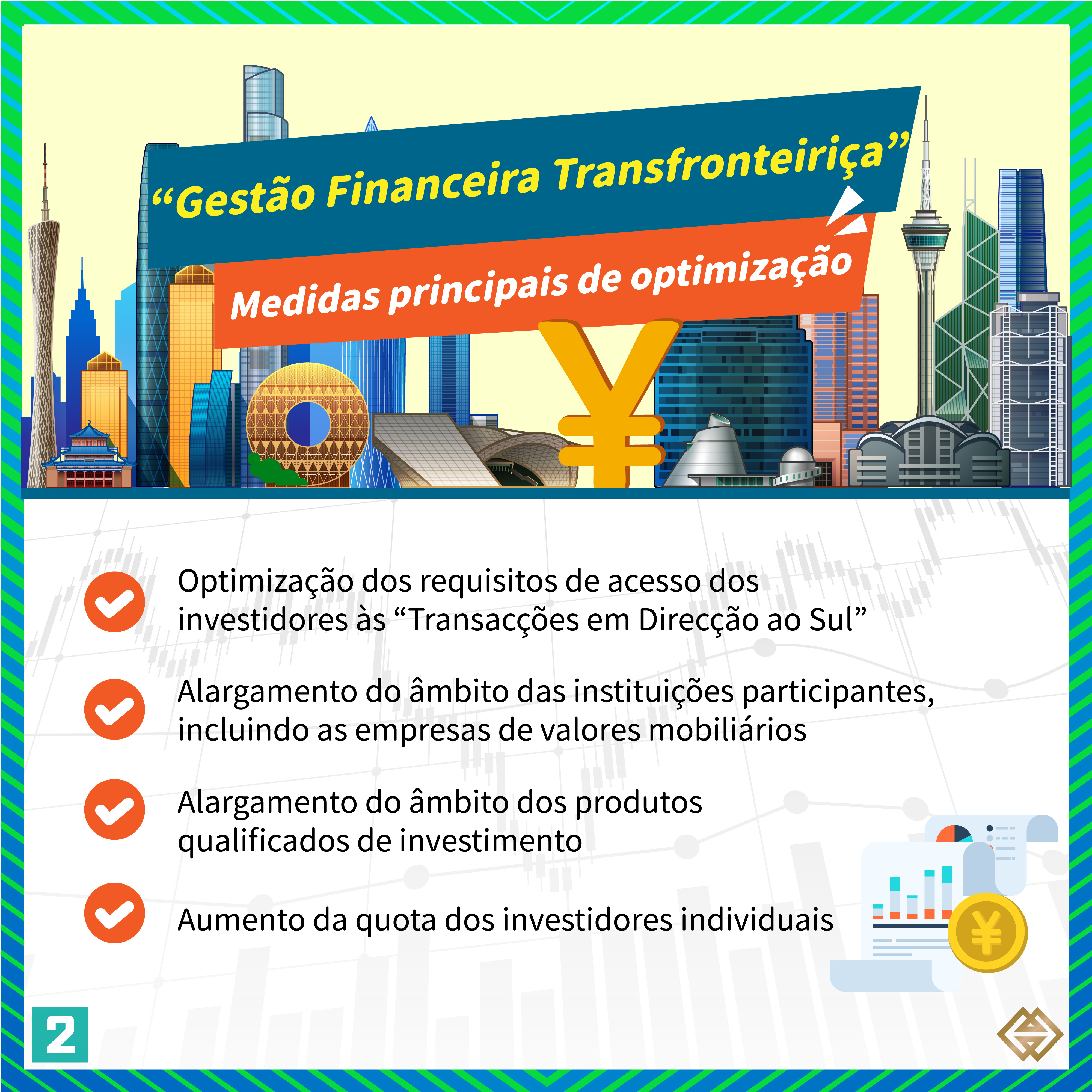 De acordo com a nova Regulamentação publicada pela AMCM, para além dos bancos de Macau autorizados a exercer a actividade de “Gestão Financeira Transfronteiriça”, as instituições financeiras licenciadas em Macau para prestar serviços relacionados com valores mobiliários (“empresas de valores mobiliários”) podem também exercer actividades de “Gestão Financeira Transfronteiriça”, em conformidade com as disposições da Regulamentação (para mais informações, consultar a lista de instituições participantes em https://www.amcm.gov.mo/zh-hant/news-notice/cross-border-financial-management/cross-border-financial-management-participating-agencies). Além disso, os investidores podem adquirir uma gama mais alargada de produtos qualificados de gestão financeira e o limite das operações dos investidores individuais foi aumentado de 1 milhão de RMB para 3 milhões de RMB. Se os investidores optarem por investir através dos canais bancários e das empresas de valores mobiliários, o limite dos investidores individuais correspondente a cada canal é de 1,5 milhões de RMB.