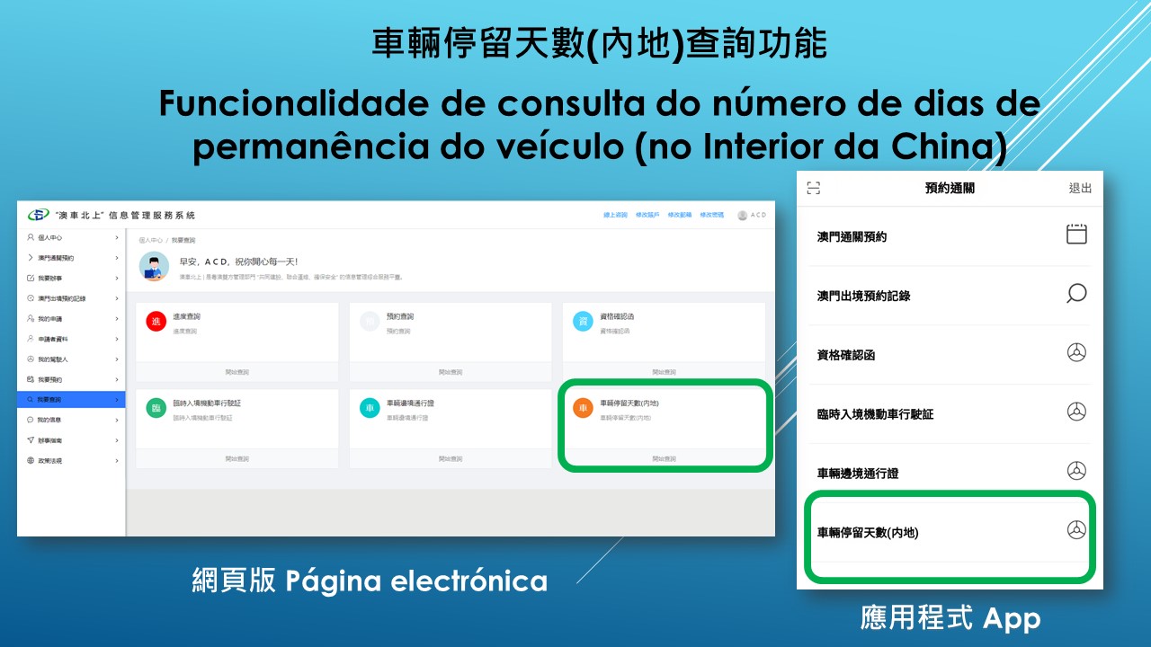 Em paralelo, será adicionada a funcionalidade de consulta do número de dias de permanência do veículo (no Interior da China) no sistema de “Circulação de veículos de Macau na província de Guangdong”. Para além de ser notificado, por mensagem SMS e correio electrónico, a proximidade do termo do prazo de permanência, o requerente pode, por sua iniciativa, consultar o número de dias de permanência tanto na página electrónica como na aplicação móvel de “Circulação de veículos de Macau na província de Guangdong”.