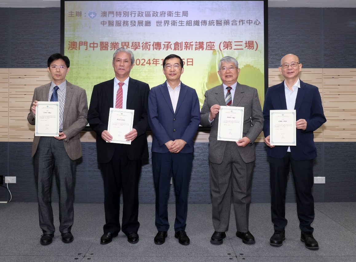 A fim de descobrir e transmitir as características e técnicas de diagnóstico e tratamento da medicina tradicional chinesa local e também de promover o desenvolvimento da medicina tradicional chinesa em Macau, recentemente, o Departamento de Desenvolvimento dos Serviços de Medicina Tradicional Chinesa dos Serviços de Saúde e o Centro de Cooperação de Medicina Tradicional da Organização Mundial de Saúde (Macau) realizaram, em conjunto, a terceira sessão de Palestra sobre a Transmissão e Inovação Académica do Sector da Medicina Tradicional Chinesa de Macau, tendo sido convidados como oradores principais, o Dr. Kuok Kuong Long, o Dr. Chao Hei Meng, o Dr. Paulo do Lago Comandante e o Dr. Chong Yiu Leung, quatro jovens médicos, de meia idade, e da terceira idade de Macau da área da medicina tradicional chinesa (MTC) com muitos anos de experiência, para partilharem as suas experiências clínicas e profissionais com o sector da medicina tradicional chinesa. Estiveram presentes o Subdirector dos Serviços de Saúde, o Dr. Cheang Seng Ip e a Coordenadora do Centro de Cooperação de Medicina Tradicional da Organização Mundial da Saúde (Macau), a Dra. Mo Hui, para presidirem a actividade.
