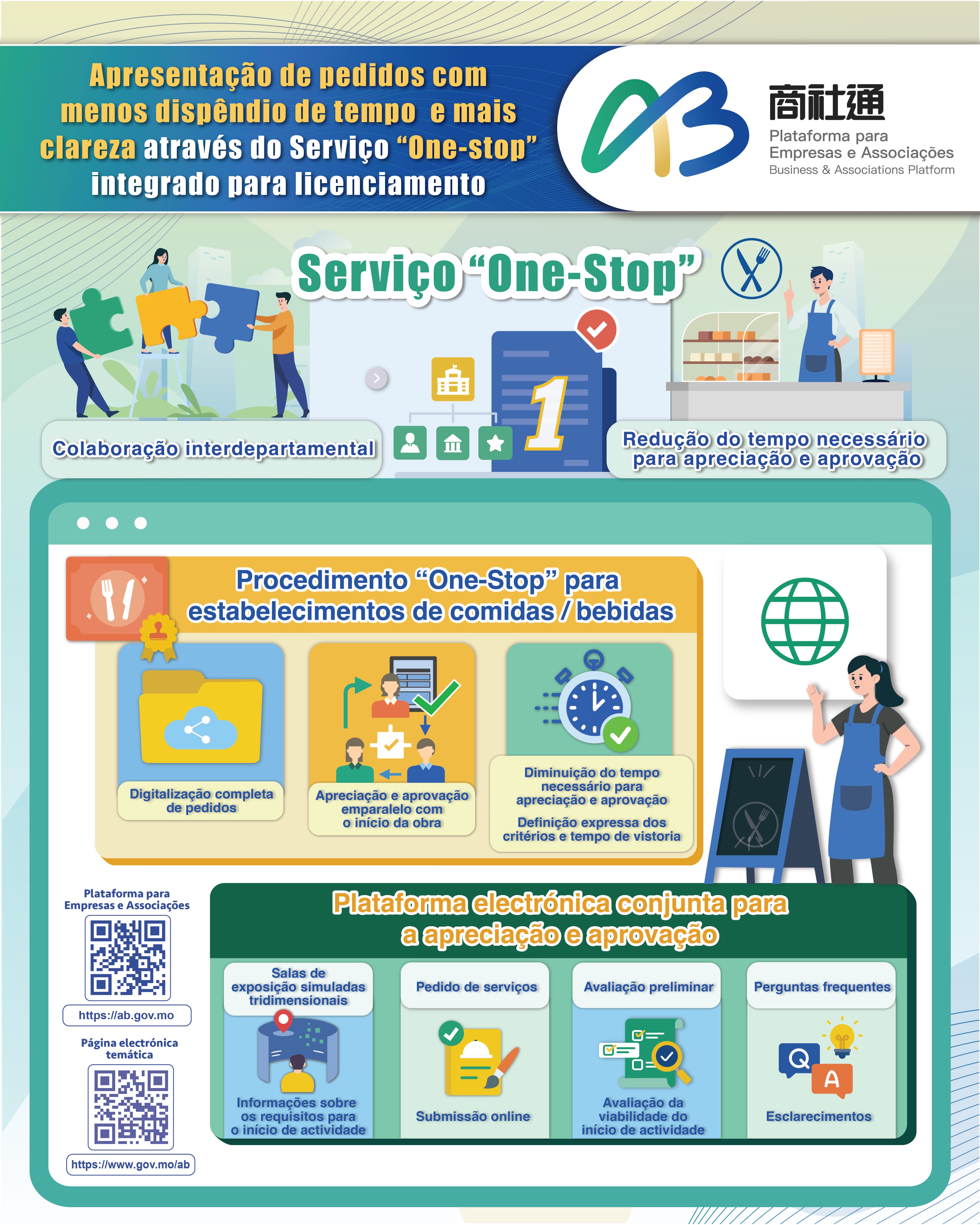 - One-Stop: Em articulação com a revisão do procedimento de licenciamento de estabelecimentos de comidas e bebidas segundo o regime de agência única, é criada uma plataforma one-stop para o requerimento e a apreciação conjuntos, permitindo a diversos serviços e empresas envolvidos no procedimento tratar e apreciar, nessa plataforma, os requerimentos de forma padronizada e regulamentada, o que contribui para aumentar a transparência e eficiência administrativa. Encontram-se, ainda, disponíveis a avaliação online, a simulação do cenário em realidade virtual 3D, a compilação das questões mais frequentes e outras ferramentas, para prestar apoio a investidores no cálculo dos custos e na gestão do funcionamento do seu estabelecimento.