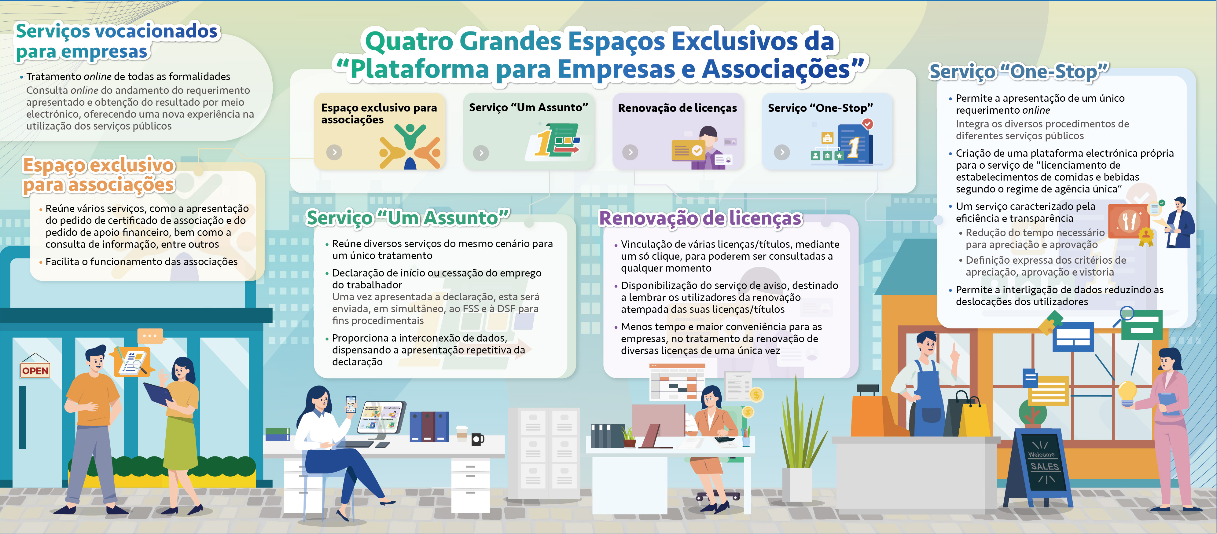 A Plataforma para Empresas e Associações procurou tomar como referência os serviços mais procurados pelas empresas e associações, incluindo o licenciamento de estabelecimentos de comidas e bebidas, a renovação de licenças e o requerimento do certificado de associação e, através da interconexão de dados e da simplificação de processos, encontram-se expostos diferentes temas numa plataforma, que permite uma operação simples por parte dos utilizadores. A plataforma dispõe de quatro espaços exclusivos, que facultam serviços concentrados: “Espaço exclusivo para associações”, “Renovação de licenças”, “One-Stop” e “Um assunto”, os quais permitem às empresas e associações obter os serviços necessários.